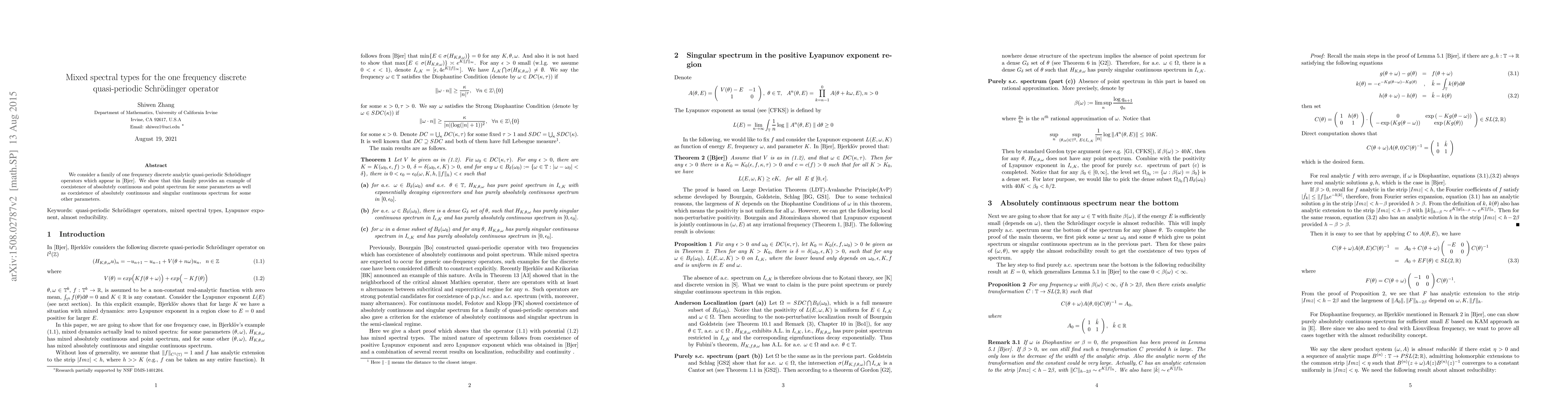 We consider a family of one frequency discrete analytic quasi-periodic Schr\"odinger operators which appear in [Bjer]. We show that this family provides an example of coexistence of absolutely continuous and point spectrum for some parameters as well as coexistence of absolutely continuous and singular continuous spectrum for some other parameters.