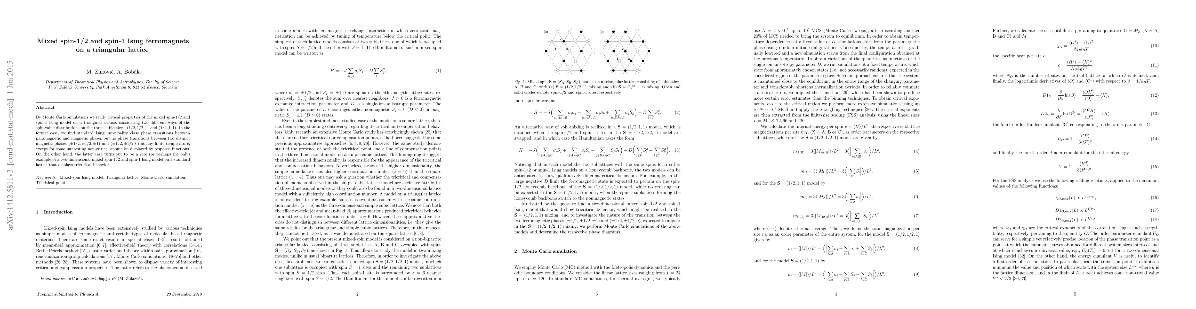 This paper investigates the critical properties of mixed spin-1/2 and spin-1 Ising ferromagnets on a triangular lattice via Monte Carlo simulations. It finds standard Ising universality for the $(1/2,1/2,1)$ spin distribution but tricritical behavior for the $(1/2,1,1)$ distribution, highlighting unique phase transition characteristics.
