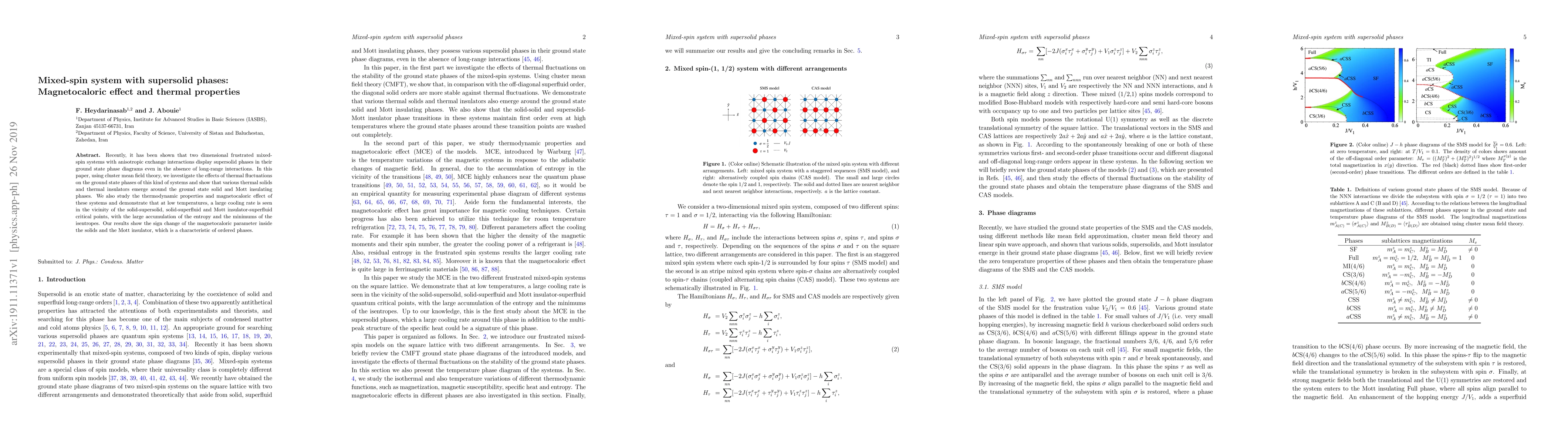 This paper explores two-dimensional frustrated mixed-spin systems using cluster mean field theory, revealing the emergence of supersolid phases and various thermal solids and insulators. It demonstrates significant magnetocaloric effects and large cooling rates near critical points, with a notable sign change in the magnetocaloric parameter in ordered phases.