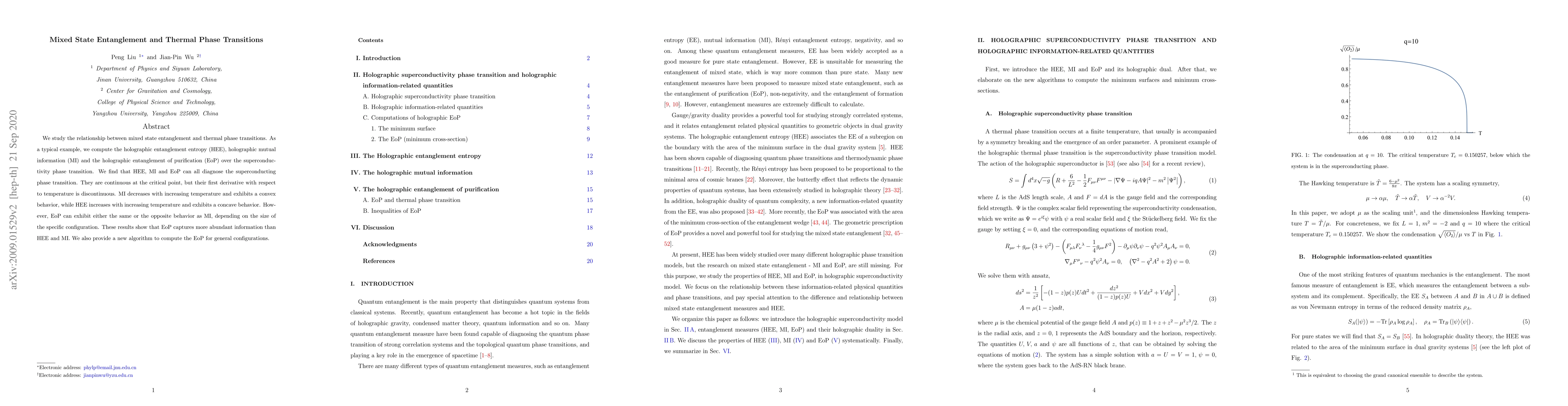 This paper investigates the connection between mixed state entanglement measures and thermal phase transitions, specifically focusing on superconductivity. It finds that holographic entanglement entropy, mutual information, and entanglement of purification all detect the phase transition, with discontinuities in their first derivatives at the critical point. The study introduces a new algorithm for computing the entanglement of purification for general configurations.