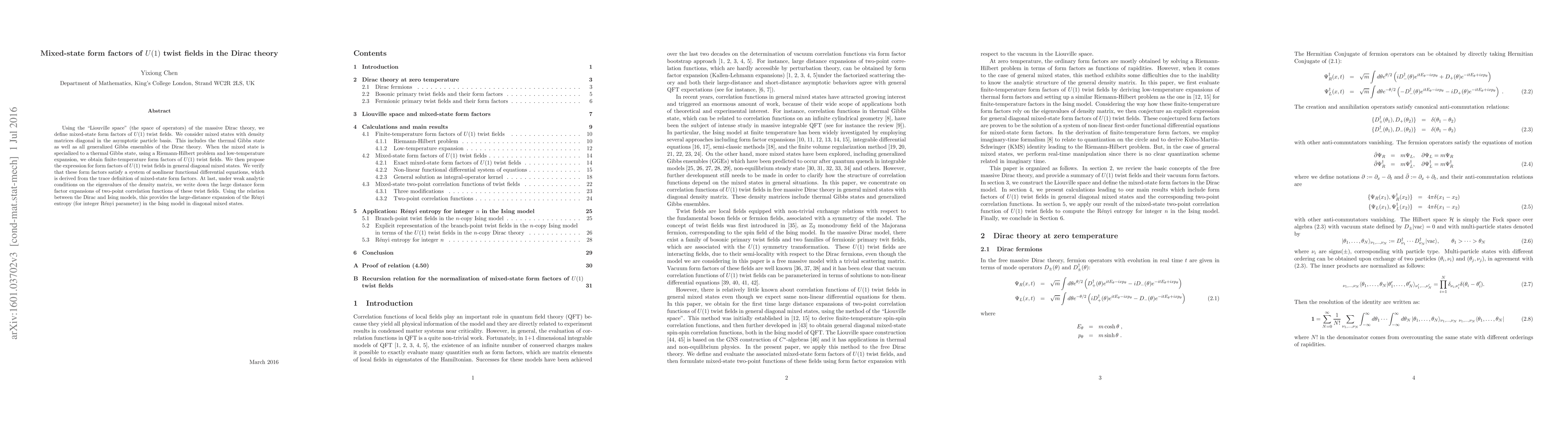 Using the "Liouville space" (the space of operators) of the massive Dirac theory, we define mixed-state form factors of $U(1)$ twist fields. We consider mixed states with density matrices diagonal in the asymptotic particle basis. This includes the thermal Gibbs state as well as all generalized Gibbs ensembles of the Dirac theory. When the mixed state is specialized to a thermal Gibbs state, using a Riemann-Hilbert problem and low-temperature expansion, we obtain finite-temperature form factors of $U(1)$ twist fields. We then propose the expression for form factors of $U(1)$ twist fields in general diagonal mixed states. We verify that these form factors satisfy a system of nonlinear functional differential equations, which is derived from the trace definition of mixed-state form factors. At last, under weak analytic conditions on the eigenvalues of the density matrix, we write down the large distance form factor expansions of two-point correlation functions of these twist fields. Using the relation between the Dirac and Ising models, this provides the large-distance expansion of the R$\acute{\text{e}}$nyi entropy (for integer R$\acute{\text{e}}$nyi parameter) in the Ising model in diagonal mixed states.