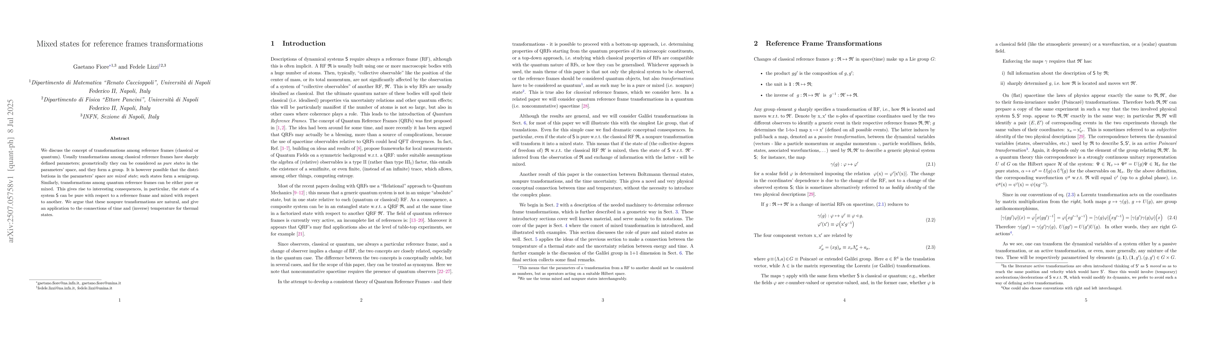 The paper explores transformations between reference frames, both classical and quantum, highlighting that these can be pure or mixed states. This leads to scenarios where a system's state is pure for one frame and mixed for another, with implications for understanding time-temperature relationships in thermal states.