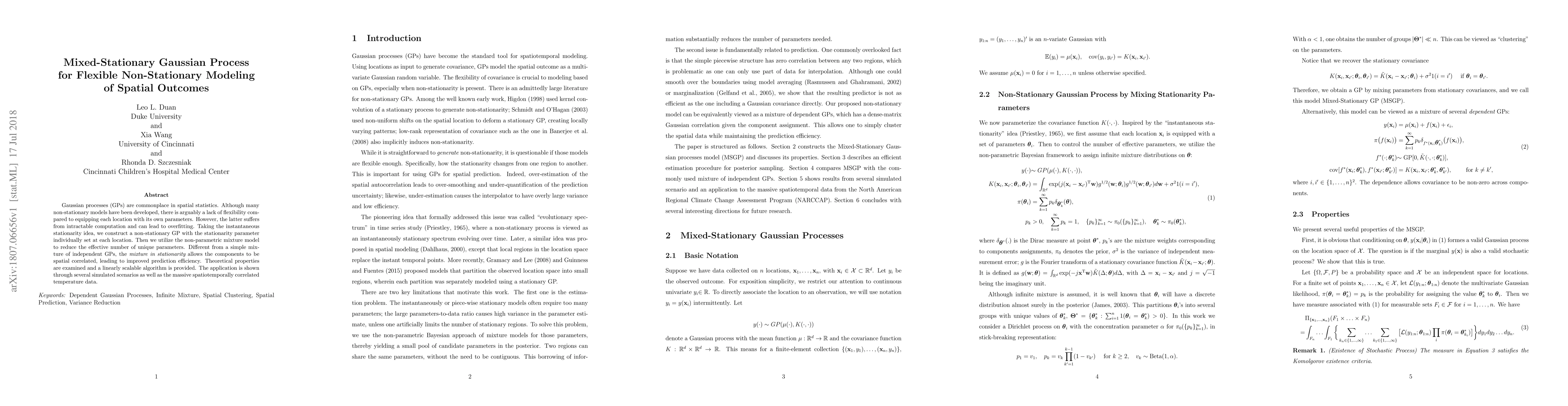 This paper proposes a mixed-stationary Gaussian process model to flexibly handle non-stationary spatial outcomes by setting stationarity parameters individually at each location. It employs a non-parametric mixture approach to reduce the number of parameters and allows spatial correlation among components, enhancing prediction efficiency.