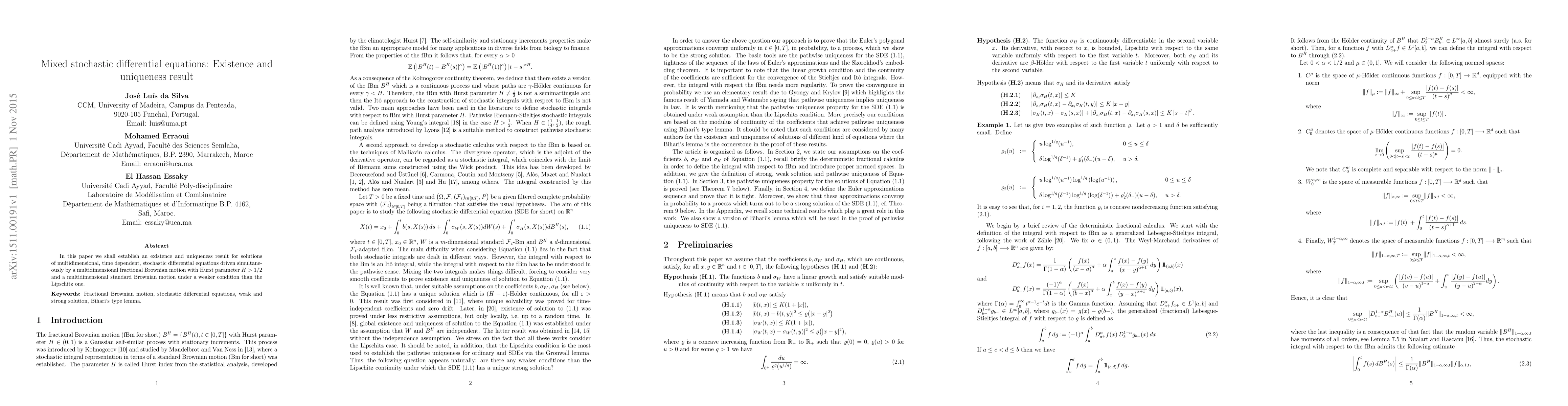 This paper establishes existence and uniqueness for solutions to multidimensional stochastic differential equations driven by fractional Brownian motion and standard Brownian motion, under conditions less restrictive than Lipschitz continuity.