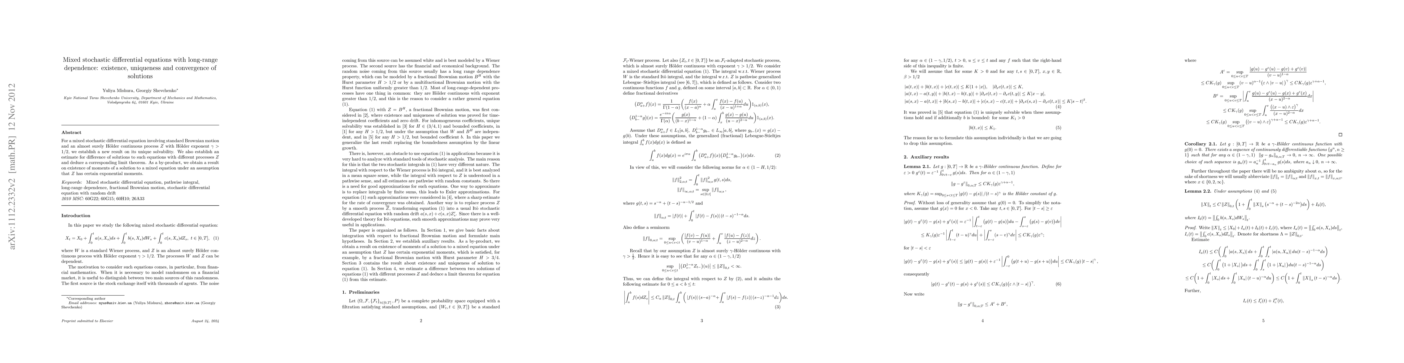 For a mixed stochastic differential equation involving standard Brownian motion and an almost surely H\"older continuous process $Z$ with H\"older exponent $\gamma>1/2$, we establish a new result on its unique solvability. We also establish an estimate for difference of solutions to such equations with different processes $Z$ and deduce a corresponding limit theorem. As a by-product, we obtain a result on existence of moments of a solution to a mixed equation under an assumption that $Z$ has certain exponential moments.