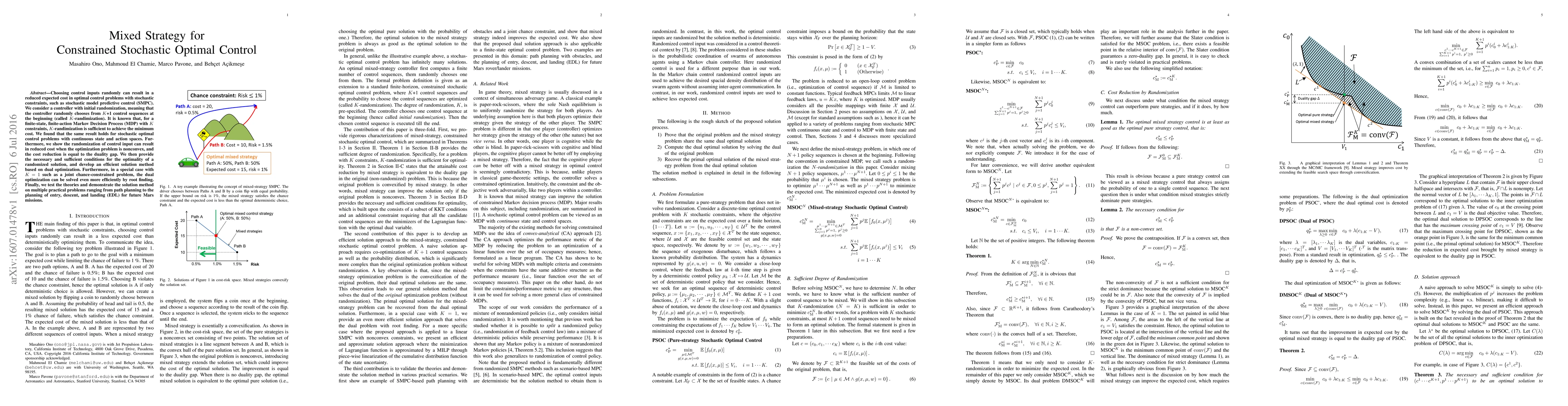 This paper explores the use of mixed strategies with initial randomization to achieve optimal control under stochastic constraints, demonstrating that K-randimization can minimize cost in both finite and continuous state-action spaces. It also shows that randomization can reduce costs in nonconvex problems and provides efficient solution methods based on dual optimization, validated through practical applications in path planning and Mars mission EDL.