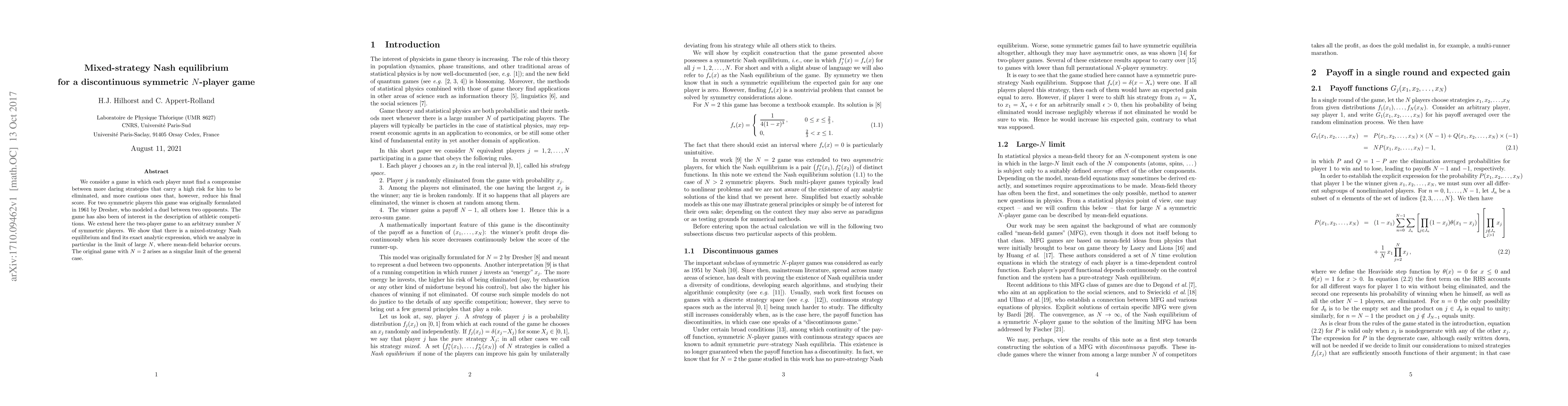 Researchers found a mixed-strategy Nash equilibrium for a game with N symmetric players, where each player balances risk and reward to maximize their score. The study also analyzed the behavior of the game as the number of players approaches infinity.
