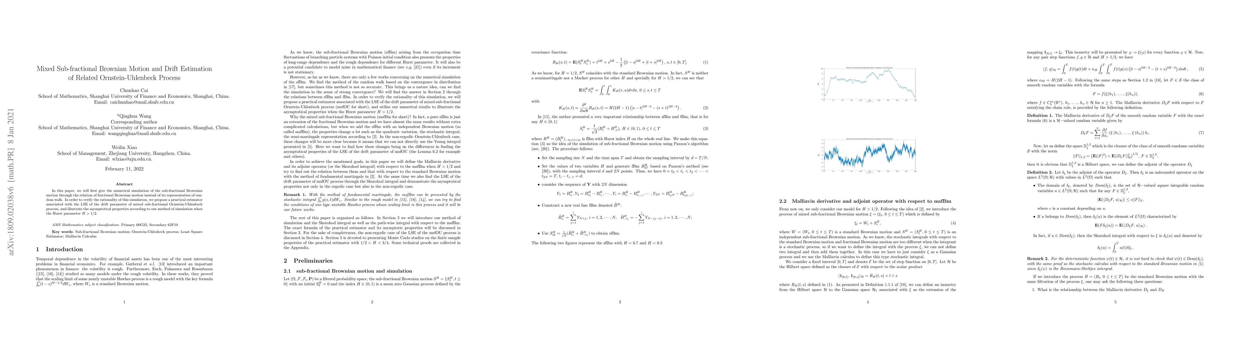 This paper simulates sub-fractional Brownian motion via fractional Brownian motion, then proposes an estimator for the drift parameter of a mixed sub-fractional Ornstein-Uhlenbeck process, demonstrating its asymptotic properties for Hurst parameters greater than 1/2.