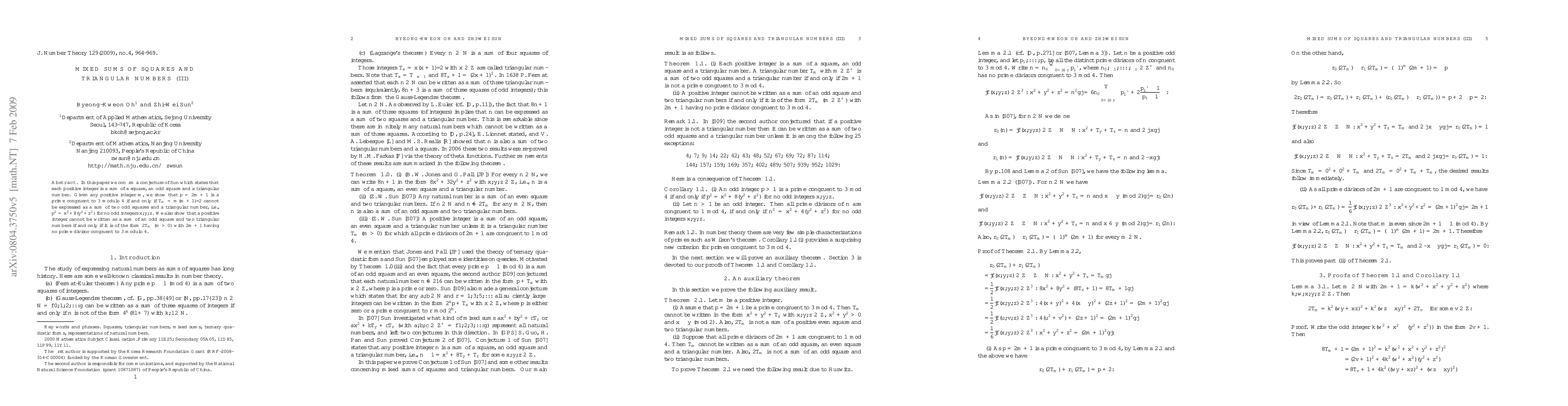 In this paper we confirm a conjecture of Sun which states that each positive integer is a sum of a square, an odd square and a triangular number. Given any positive integer m, we show that p=2m+1 is a prime congruent to 3 modulo 4 if and only if T_m=m(m+1)/2 cannot be expressed as a sum of two odd squares and a triangular number, i.e., p^2=x^2+8(y^2+z^2) for no odd integers x,y,z. We also show that a positive integer cannot be written as a sum of an odd square and two triangular numbers if and only if it is of the form 2T_m (m>0) with 2m+1 having no prime divisor congruent to 3 modulo 4.