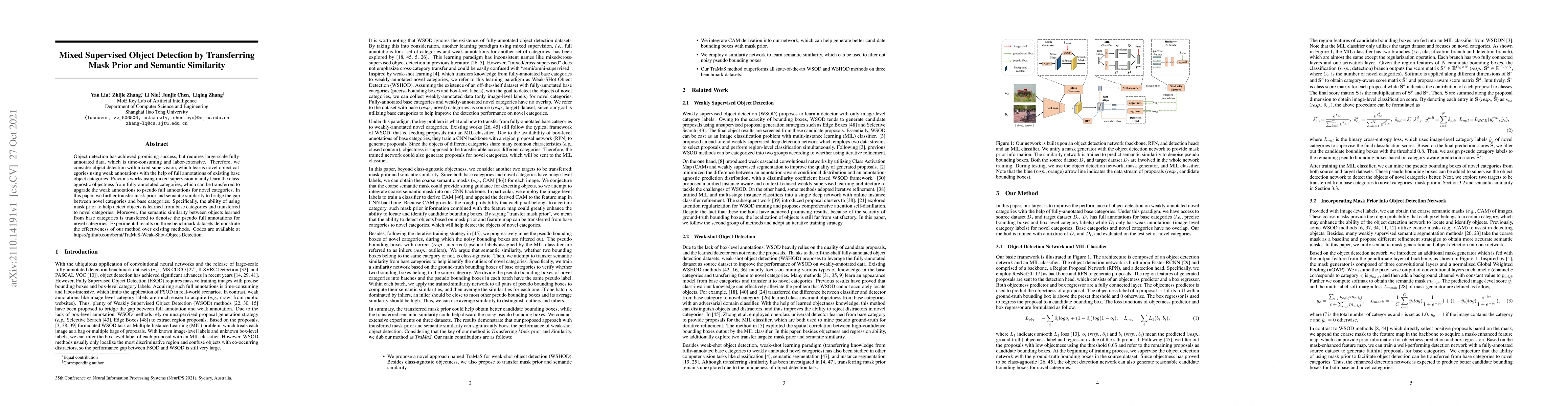 This paper proposes a method for mixed supervised object detection that leverages mask prior and semantic similarity to learn novel object categories from weak annotations, using fully-annotated base categories for transfer. Experimental results show improved performance over existing methods on benchmark datasets.