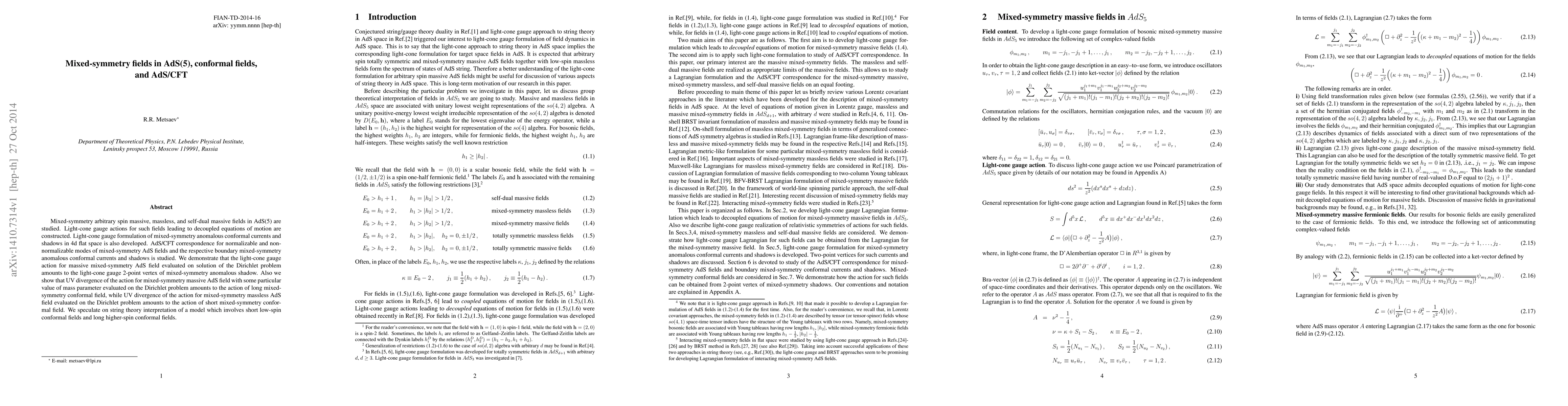 This paper studies mixed-symmetry fields in AdS(5) and their connection to conformal fields in 4d flat space via AdS/CFT. It constructs light-cone gauge actions for these fields and explores the relationship between normalizable/non-normalizable AdS modes and boundary anomalous conformal currents, revealing UV divergence interpretations in terms of long/short conformal fields.