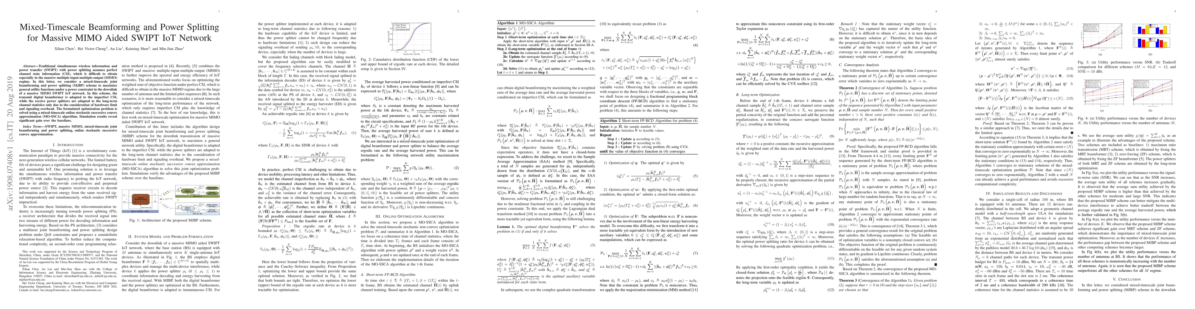This paper proposes a mixed-timescale joint beamforming and power splitting (MJBP) scheme for a massive MIMO SWIPT IoT network to maximize utility under power constraints. The scheme adapts the transmit beamformer to imperfect channel state information and the receive power splitters to long-term channel statistics, solved using a MO-SSCA algorithm, showing significant performance gains.