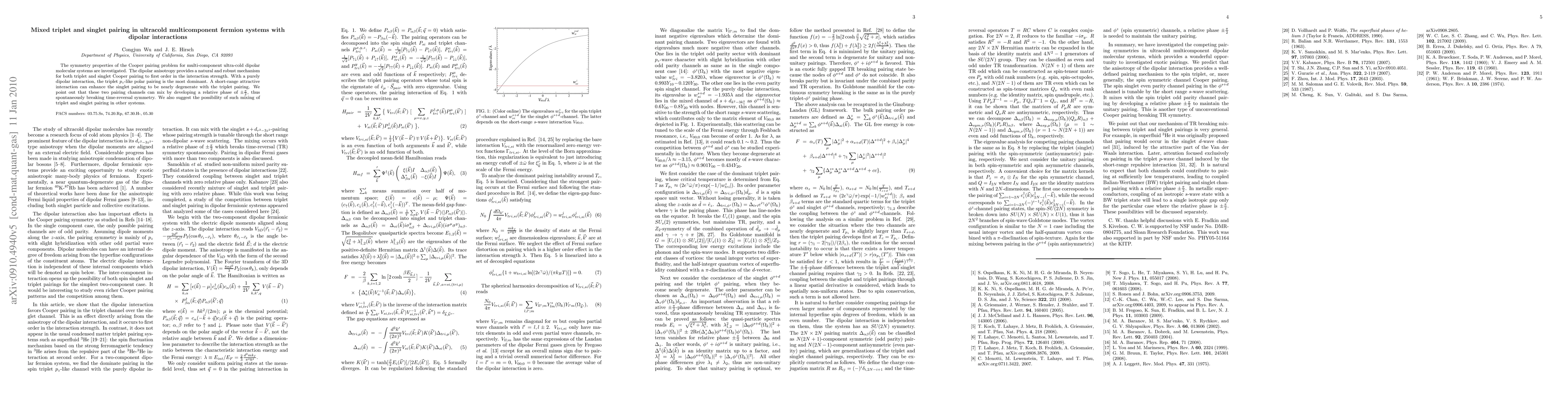 The symmetry properties of the Cooper pairing problem for multi-component ultra-cold dipolar molecular systems are investigated. The dipolar anisotropy provides a natural and robust mechanism for both triplet and singlet Cooper pairing to first order in the interaction strength. With a purely dipolar interaction, the triplet $p_z$-like polar pairing is the most dominant. A short-range attractive interaction can enhance the singlet pairing to be nearly degenerate with the triplet pairing. We point out that these two pairing channels can mix by developing a relative phase of $\pm\frac{\pi}{2}$, thus spontaneously breaking time-reversal symmetry. We also suggest the possibility of such mixing of triplet and singlet pairing in other systems.