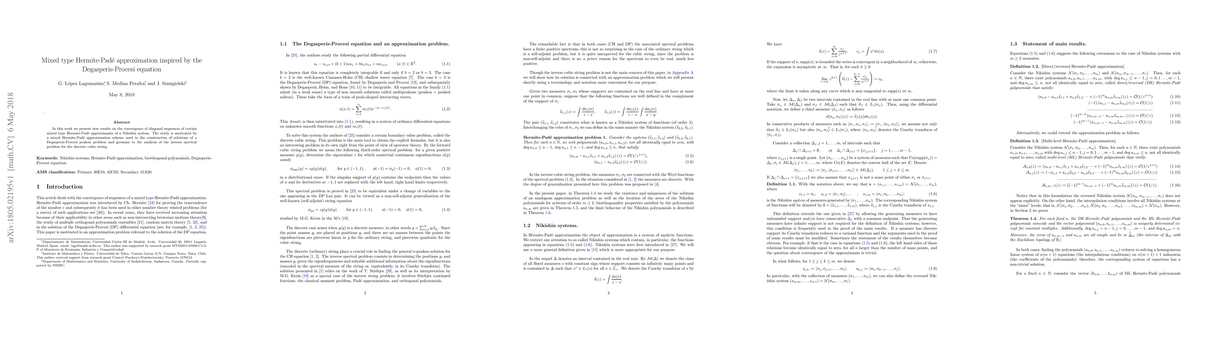 In this work we present new results on the convergence of diagonal sequences of certain mixed type Hermite-Pad\'e approximants of a Nikishin system. The study is motivated by a mixed Hermite-Pad\'e approximation scheme used in the construction of solutions of a Degasperis-Procesi peakon problem and germane to the analysis of the inverse spectral problem for the discrete cubic string.