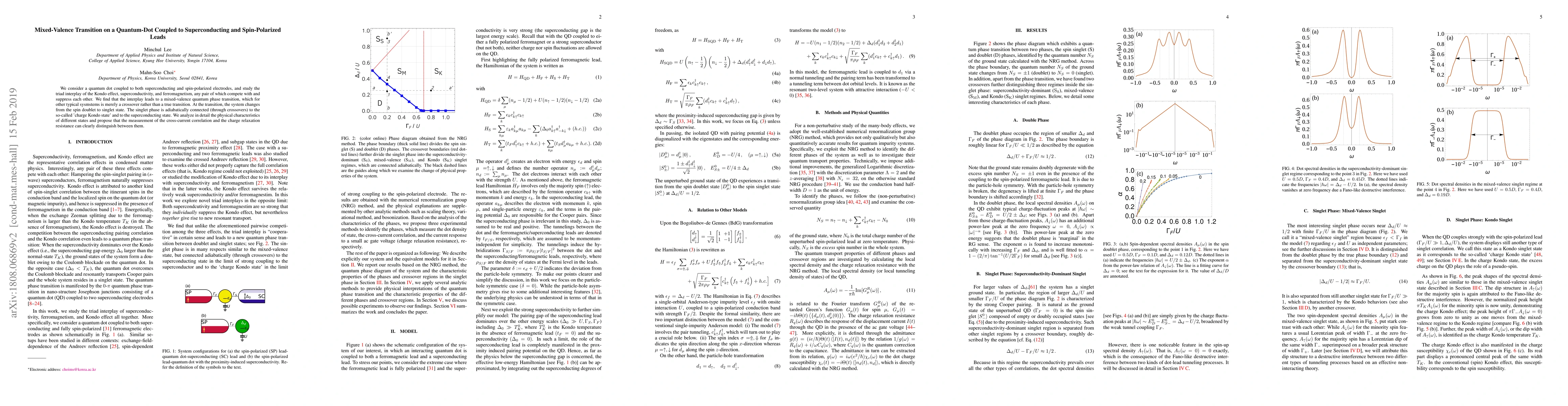 We consider a quantum dot coupled to both superconducting and spin-polarized electrodes, and study the triad interplay of the Kondo effect, superconductivity, and ferromagnetism, any pair of which compete with and suppress each other. We find that the interplay leads to a mixed-valence quantum phase transition, which for other typical sysmstems is merely a crossover rather than a true transition. At the transition, the system changes from the spin doublet to singlet state. The singlet phase is adiabatically connected (through crossovers) to the so-called 'charge Kondo state' and to the superconducting state. We analyze in detail the physical characteristics of different states and propose that the measurement of the cross-current correlation and the charge relaxation resistance can clearly distinguish between them.