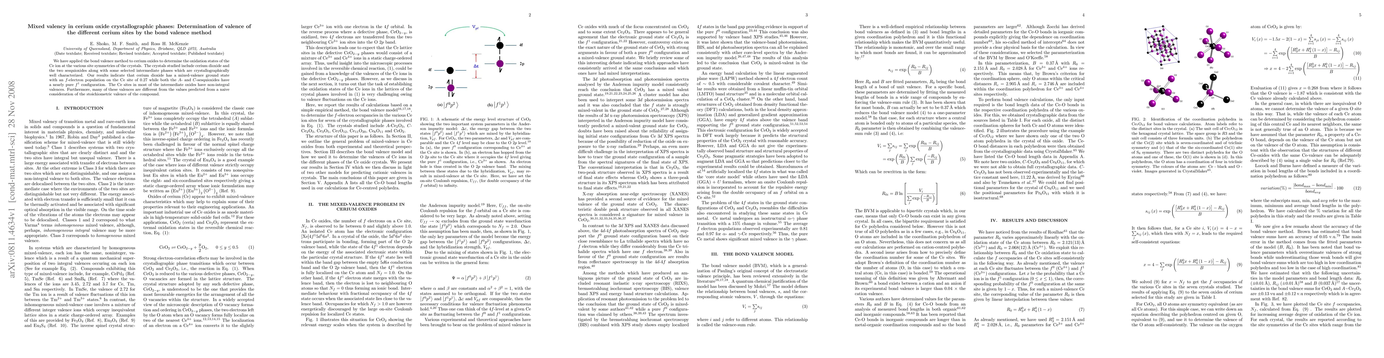 This study uses the bond valence method to determine the oxidation states of cerium ions in various cerium oxide phases, revealing mixed-valence in cerium dioxide with a non-integral f-electron population, while sesquioxides exhibit nearly pure f^1 configurations. Intermediate phases show non-integral valences differing from stoichiometric predictions.