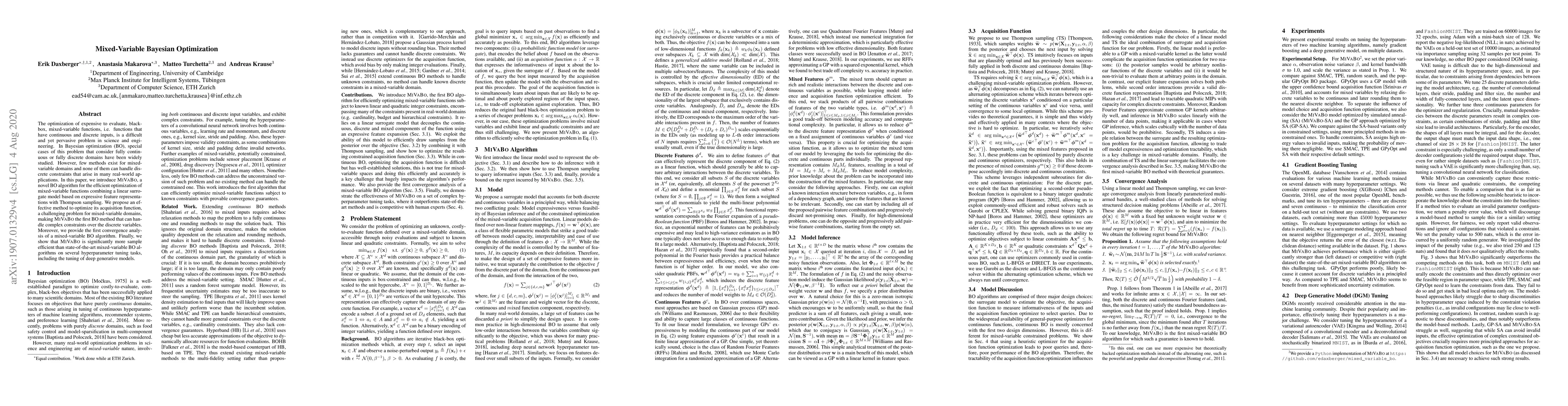 This paper introduces MiVaBo, a novel Bayesian optimization algorithm for mixed-variable functions, combining a linear surrogate model with Thompson sampling to handle both continuous and discrete inputs, including discrete constraints. It also provides the first convergence analysis for such mixed-variable BO methods and demonstrates superior sample efficiency over existing algorithms.