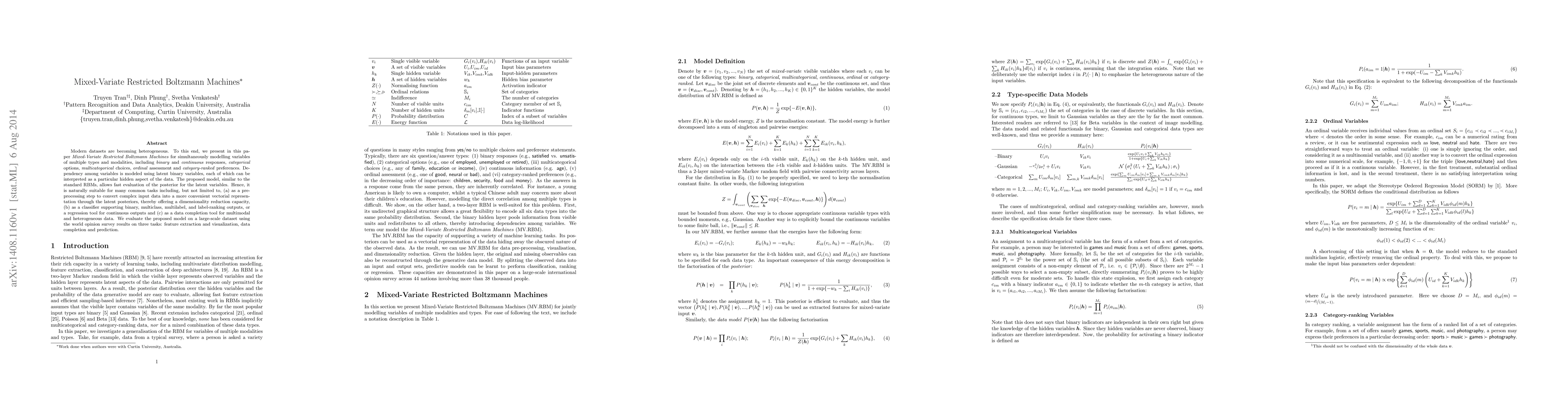 Modern datasets are becoming heterogeneous. To this end, we present in this paper Mixed-Variate Restricted Boltzmann Machines for simultaneously modelling variables of multiple types and modalities, including binary and continuous responses, categorical options, multicategorical choices, ordinal assessment and category-ranked preferences. Dependency among variables is modeled using latent binary variables, each of which can be interpreted as a particular hidden aspect of the data. The proposed model, similar to the standard RBMs, allows fast evaluation of the posterior for the latent variables. Hence, it is naturally suitable for many common tasks including, but not limited to, (a) as a pre-processing step to convert complex input data into a more convenient vectorial representation through the latent posteriors, thereby offering a dimensionality reduction capacity, (b) as a classifier supporting binary, multiclass, multilabel, and label-ranking outputs, or a regression tool for continuous outputs and (c) as a data completion tool for multimodal and heterogeneous data. We evaluate the proposed model on a large-scale dataset using the world opinion survey results on three tasks: feature extraction and visualization, data completion and prediction.