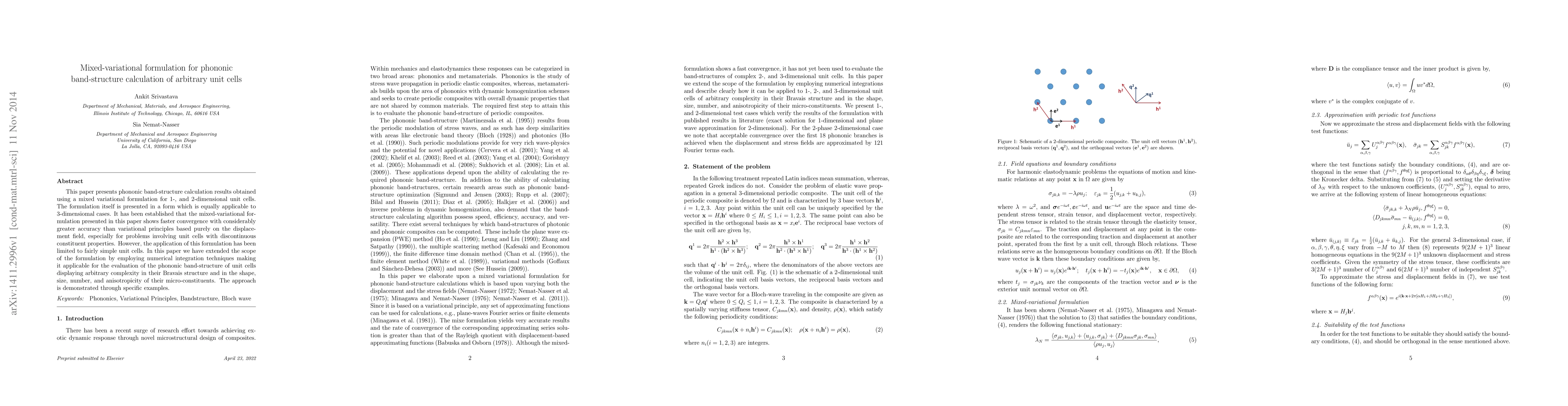 This paper introduces a mixed-variational formulation for phononic band-structure calculations that shows faster convergence and greater accuracy, especially for complex unit cells with discontinuous properties. The method is now extended to handle arbitrary unit cell complexities using numerical integration techniques.