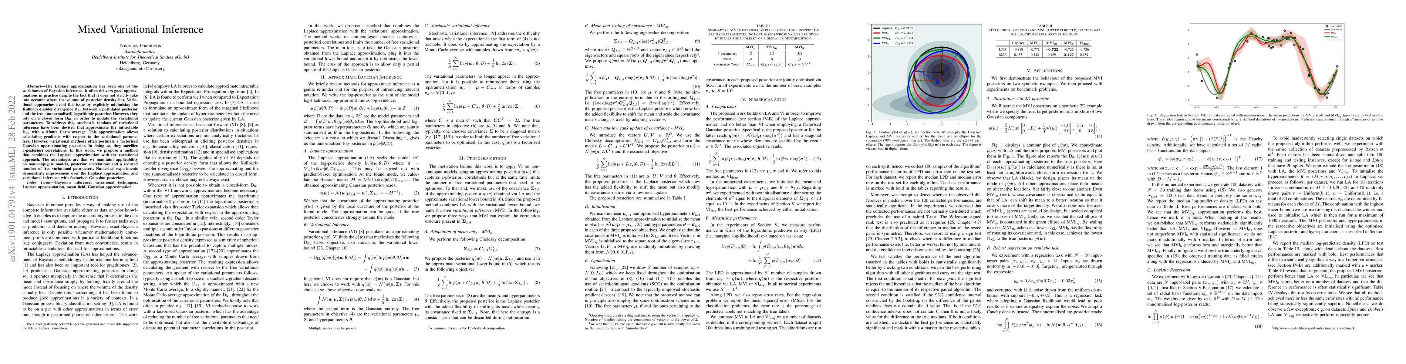 This paper proposes a mixed variational inference method that combines the Laplace approximation with variational inference to maintain applicability on non-conjugate models, preserve posterior correlations, and reduce the number of variational parameters. Numerical experiments show improvements over traditional Laplace and variational methods.