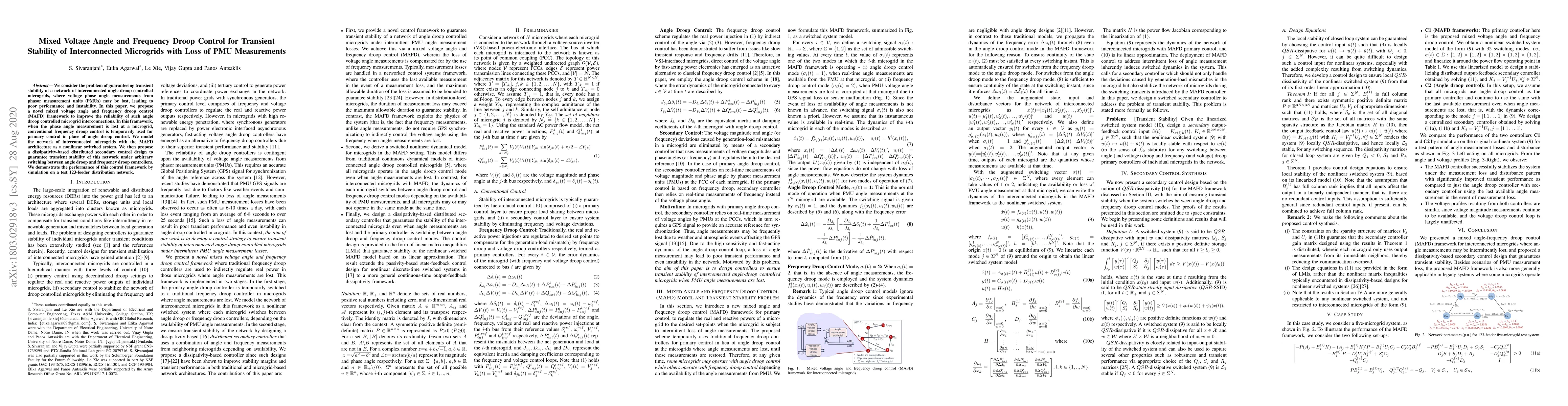 This paper proposes a mixed voltage angle and frequency droop control framework to enhance transient stability in interconnected microgrids, especially when phasor measurement unit (PMU) data is lost. It introduces a method that switches between angle droop and frequency droop controls to maintain stability, and uses a dissipativity-based distributed secondary control design to ensure transient stability under varying control conditions.