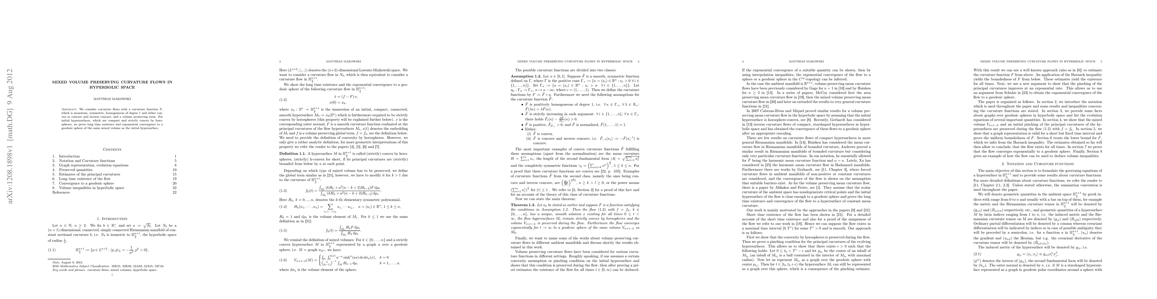 This paper investigates mixed volume preserving curvature flows in hyperbolic space, focusing on strictly convex initial hypersurfaces. The authors demonstrate long-time existence and exponential convergence to a geodesic sphere under specific conditions on the curvature function.