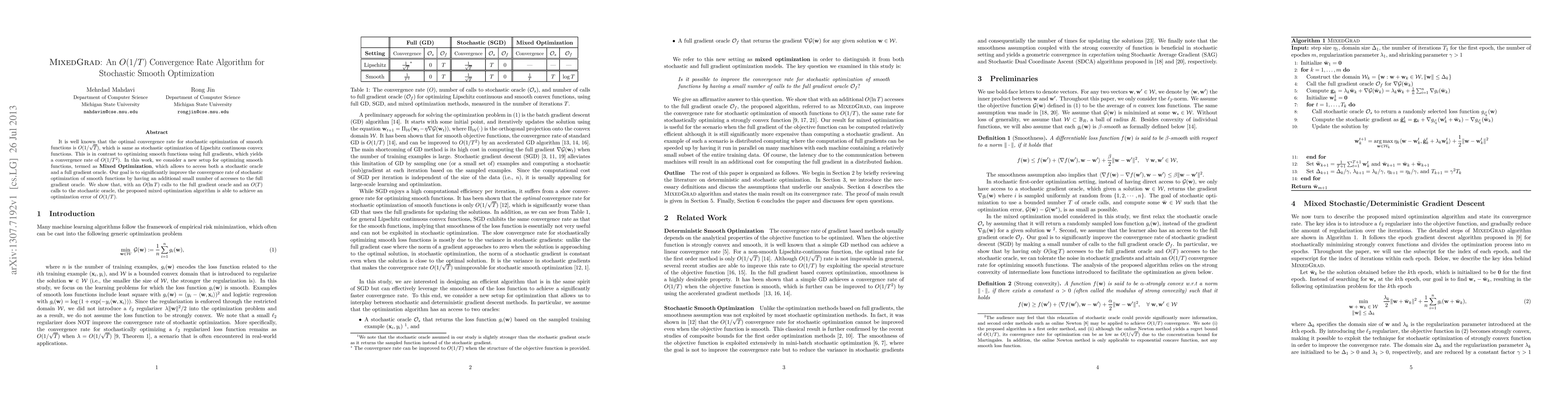 Title: MixedGrad: An O(1/T) Convergence Rate Algorithm for Stochastic Smooth Optimization Summary: This paper introduces MixedGrad, a novel optimization algorithm that leverages both stochastic and full gradient information to achieve an optimal convergence rate of O(1/T) for smooth function optimization, significantly improving upon the traditional O(1/√T) rate.