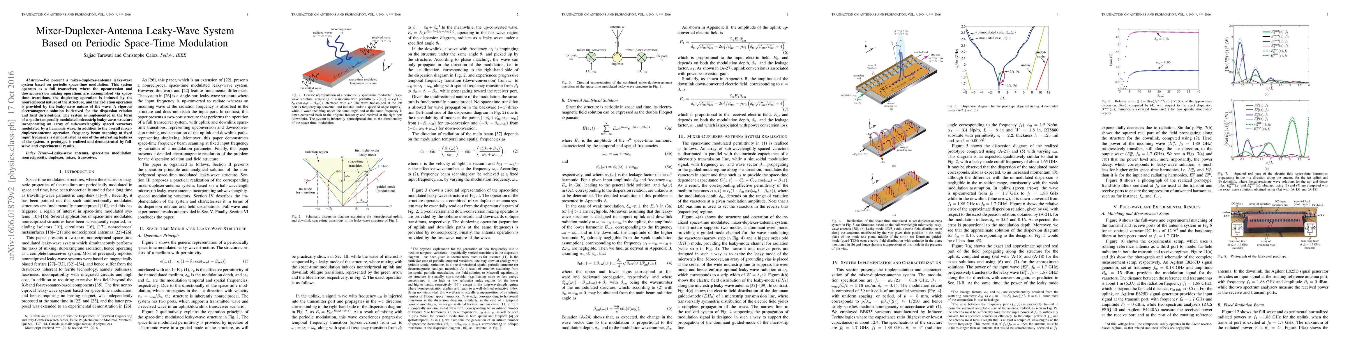 The paper introduces a novel mixer-duplexer-antenna leaky-wave system utilizing periodic space-time modulation for full transceiver operations, demonstrating frequency beam scanning at a fixed input frequency through a prototype. The system is implemented as a spatio-temporally modulated microstrip structure with varactor modulation, supported by rigorous electromagnetic analysis.