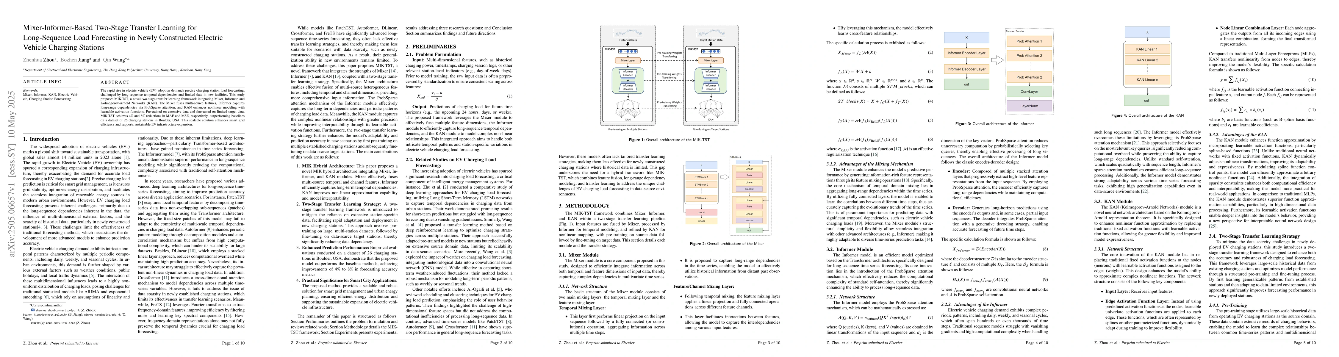 The rapid rise in electric vehicle (EV) adoption demands precise charging station load forecasting, challenged by long-sequence temporal dependencies and limited data in new facilities. This study proposes MIK-TST, a novel two-stage transfer learning framework integrating Mixer, Informer, and Kolmogorov-Arnold Networks (KAN). The Mixer fuses multi-source features, Informer captures long-range dependencies via ProbSparse attention, and KAN enhances nonlinear modeling with learnable activation functions. Pre-trained on extensive data and fine-tuned on limited target data, MIK-TST achieves 4% and 8% reductions in MAE and MSE, respectively, outperforming baselines on a dataset of 26 charging stations in Boulder, USA. This scalable solution enhances smart grid efficiency and supports sustainable EV infrastructure expansion.