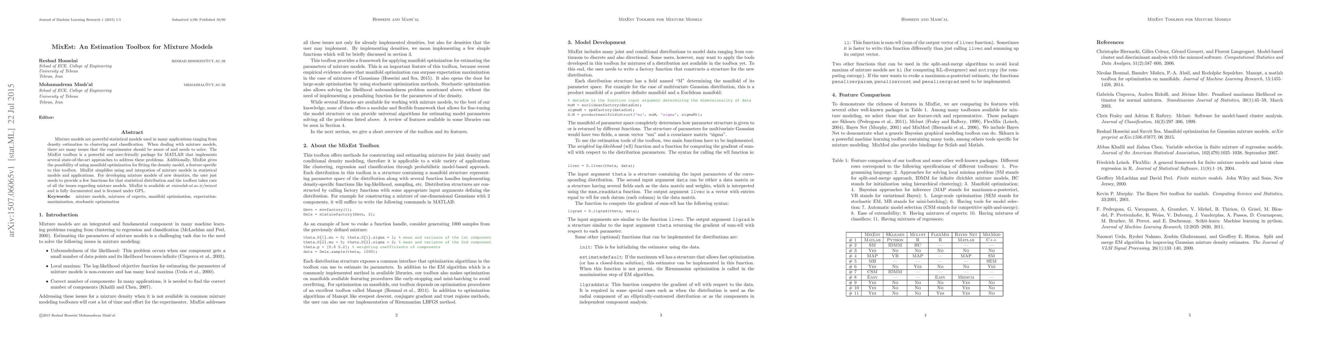 MixEst is a MATLAB toolbox implementing state-of-the-art approaches for addressing issues in mixture models, including manifold optimization for parameter estimation. It provides a modular and flexible framework for constructing and estimating mixture models for both joint and conditional density modeling, applicable to various applications like clustering, regression, and classification.