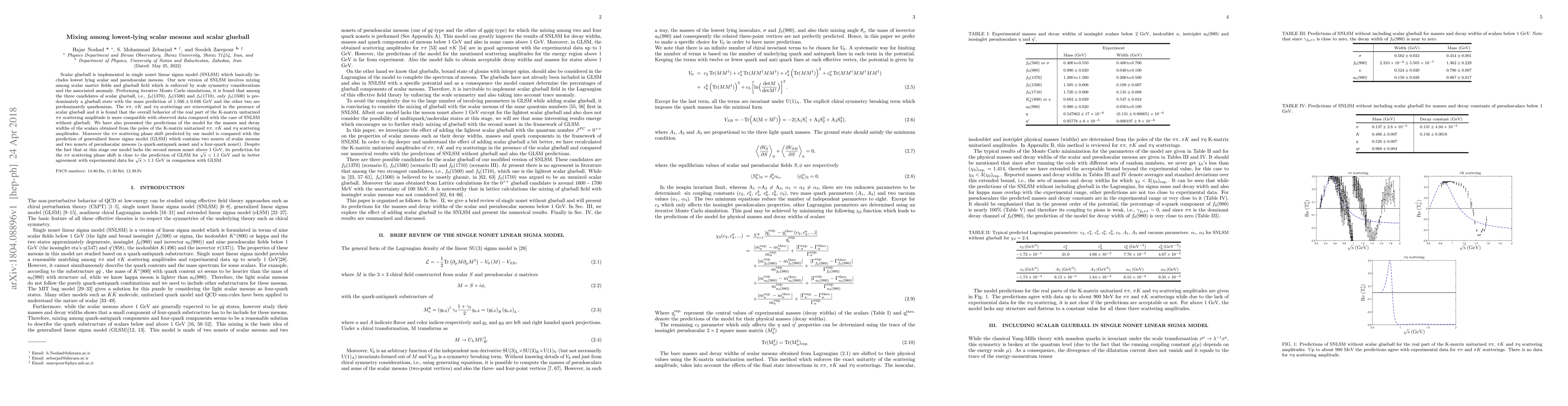 Scalar glueball is implemented in single nonet linear sigma model (SNLSM) which basically includes lowest lying scalar and pseudoscalar mesons. Our new version of SNLSM involves mixing among scalar matter fields and glueball field which is enforced by scale symmetry considerations and the associated anomaly. Performing iterative Monte Carlo simulations, it is found that among the three candidates of scalar glueball, i.e., $f_0(1370)$, $f_0(1500)$ and $f_0(1710)$, only $f_0(1500)$ is predominately a glueball state with the mass prediction of $1.566 \pm 0.046$ GeV and the other two are predominately quarkonium. The $\pi\pi$, $\pi K$ and $\pi \eta$ scatterings are reinvestigated in the presence of scalar glueball and it is found that the overall behavior of the real part of the K-matrix unitarized $\pi \pi$ scattering amplitude is more compatible with observed data compared with the case of SNLSM without glueball. We have also presented the predictions of the model for the masses and decay widths of the scalars obtained from the poles of the K-matrix unitarized $\pi\pi$, $\pi K$ and $\pi \eta$ scattering amplitudes. Moreover the $\pi\pi$ scattering phase shift predicted by our model is compared with the prediction of generalized linear sigma model (GLSM) which contains two nonets of scalar mesons and two nonets of pseudoscalar mesons (a quark-antiquark nonet and a four-quark nonet). Despite the fact that at this stage our model lacks the second meson nonet above $1$ GeV, its prediction for the $\pi\pi$ scattering phase shift is close to the prediction of GLSM for $\sqrt{s}<1.1$ GeV and in better agreement with experimental data for $\sqrt{s}>1.1$ GeV in comparison with GLSM.