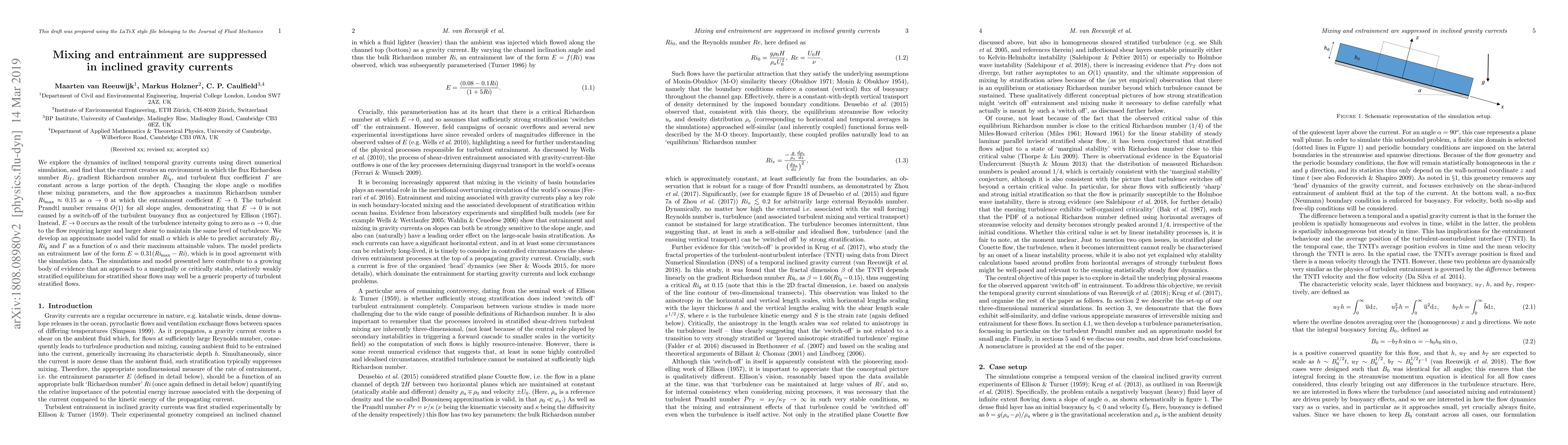 A numerical simulation study was conducted to investigate the effects of inclined gravity currents on entrainment and mixing.