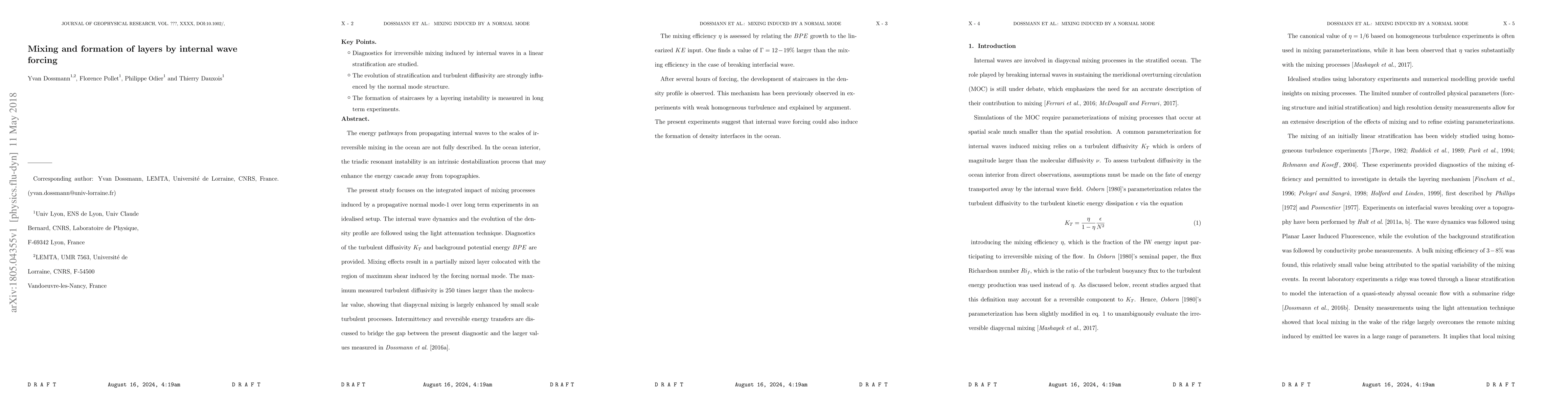 The energy pathways from propagating internal waves to the scales of irreversible mixing in the ocean are not fully described. In the ocean interior, the triadic resonant instability is an intrinsic destabilization process that may enhance the energy cascade away from topographies. The present study focuses on the integrated impact of mixing processes induced by a propagative normal mode-1 over long term experiments in an idealised setup. The internal wave dynamics and the evolution of the density profile are followed using the light attenuation technique. Diagnostics of the turbulent diffusivity $K_{T}$ and background potential energy $BPE$ are provided. Mixing effects result in a partially mixed layer colocated with the region of maximum shear induced by the forcing normal mode. The maximum measured turbulent diffusivity is 250 times larger than the molecular value, showing that diapycnal mixing is largely enhanced by small scale turbulent processes. Intermittency and reversible energy transfers are discussed to bridge the gap between the present diagnostic and the larger values measured in Dossmann et al, Experiments in Fluids, 57(8), 132 (2016). The mixing efficiency $\eta$ is assessed by relating the $BPE$ growth to the linearized $KE$ input. One finds a value of $\Gamma=12-19\%$ larger than the mixing efficiency in the case of breaking interfacial wave. After several hours of forcing, the development of staircases in the density profile is observed. This mechanism has been previously observed in experiments with weak homogeneous turbulence and explained by argument. The present experiments suggest that internal wave forcing could also induce the formation of density interfaces in the ocean.