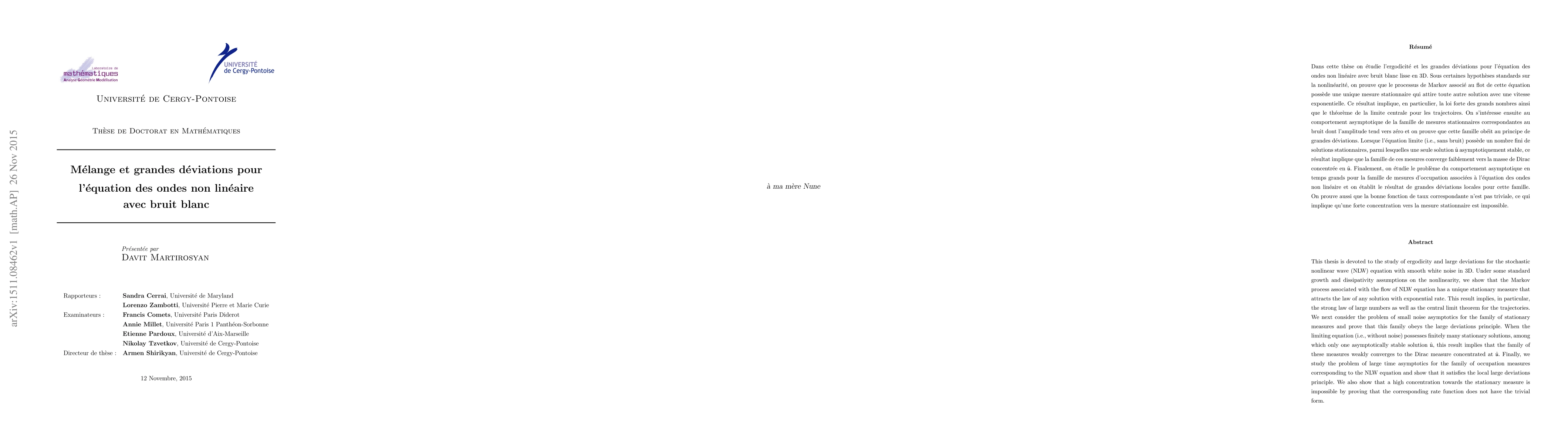 This thesis is devoted to the study of ergodicity and large deviations for the stochastic nonlinear wave (NLW) equation with smooth white noise in 3D. Under some standard growth and dissipativity assumptions on the nonlinearity, we show that the Markov process associated with the flow of NLW equation has a unique stationary measure that attracts the law of any solution with exponential rate. This result implies, in particular, the strong law of large numbers as well as the central limit theorem for the trajectories. We next consider the problem of small noise asymptotics for the family of stationary measures and prove that this family obeys the large deviations principle. When the limiting equation (i.e., without noise) possesses finitely many stationary solutions, among which only one asymptotically stable solution "u", this result implies that the family of these measures weakly converges to the Dirac measure concentrated at "u". Finally, we study the problem of large time asymptotics for the family of occupation measures corresponding to the NLW equation and show that it satisfies the local large deviations principle. We also show that a high concentration towards the stationary measure is impossible by proving that the corresponding rate function does not have the trivial form.