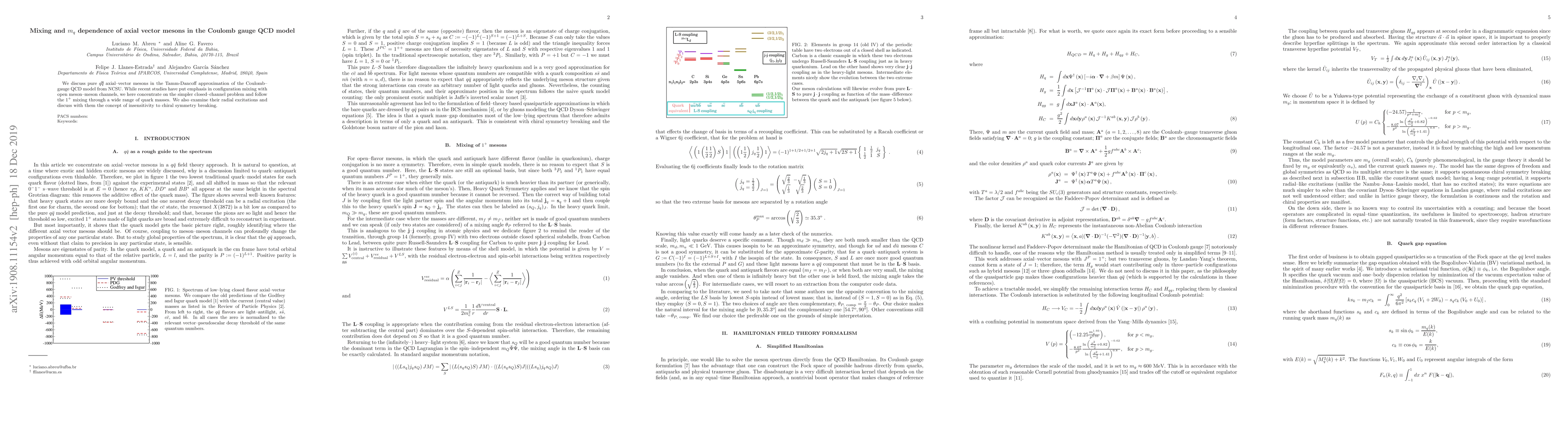 We discuss pure $q\bar{q}$ axial-vector mesons in the Tamm-Dancoff approximation of the Coulomb-gauge QCD model from NCSU. While recent studies have put emphasis in configuration mixing with open meson-meson channels, we here concentrate on the simpler closed-channel problem and follow the $1^+$ mixing through a wide range of quark masses. We also examine their radial excitations and discuss with them the concept of insensitivity to chiral symmetry breaking.