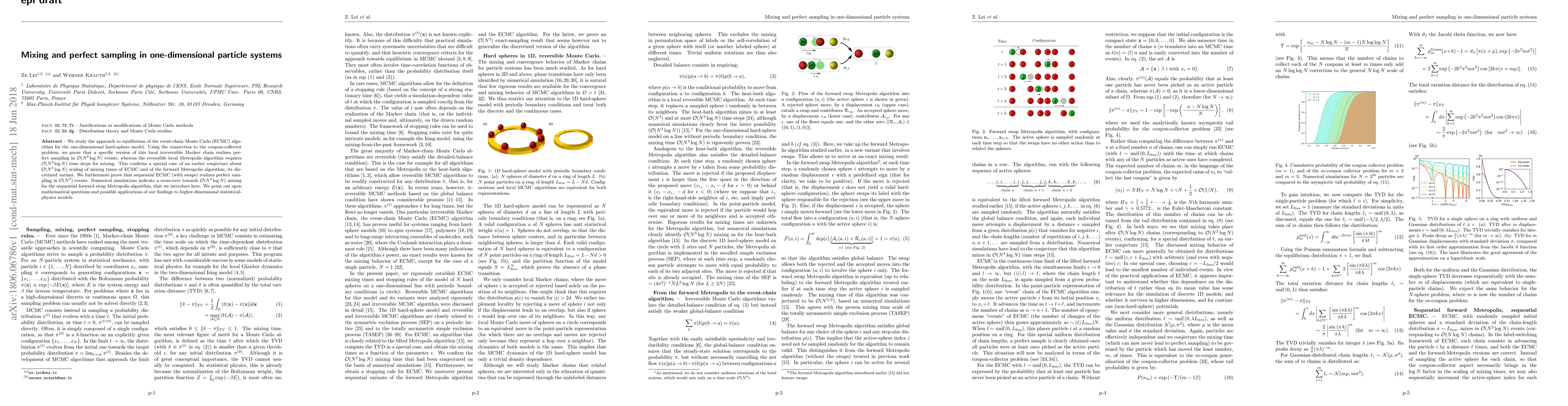 We study the approach to equilibrium of the event-chain Monte Carlo (ECMC) algorithm for the one-dimensional hard-sphere model. Using the connection to the coupon-collector problem, we prove that a specific version of this local irreversible Markov chain realizes perfect sampling in O(N^2 log N) events, whereas the reversible local Metropolis algorithm requires O(N^3 log N) time steps for mixing. This confirms a special case of an earlier conjecture about O(N^2 log N) scaling of mixing times of ECMC and of the forward Metropolis algorithm, its discretized variant. We furthermore prove that sequential ECMC (with swaps) realizes perfect sampling in O(N^2) events. Numerical simulations indicate a cross-over towards O(N^2 log N) mixing for the sequential forward swap Metropolis algorithm, that we introduce here. We point out open mathematical questions and possible applications of our findings to higher-dimensional statistical-physics models.