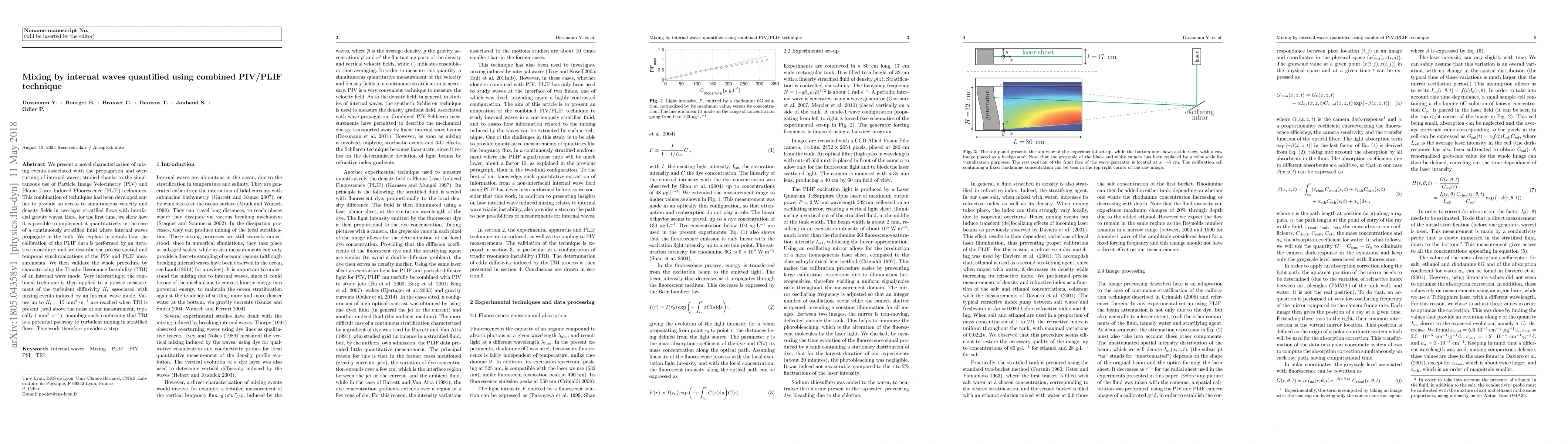 This paper introduces a combined PIV/PLIF technique for quantifying mixing events caused by internal waves in continuously stratified fluids, achieving precise measurements of turbulent diffusivity K_t. The study validates the method through the characterization of Triadic Resonance Instability (TRI) and demonstrates significant turbulent mixing, with K_t values up to 15 mm^2·s^-1.