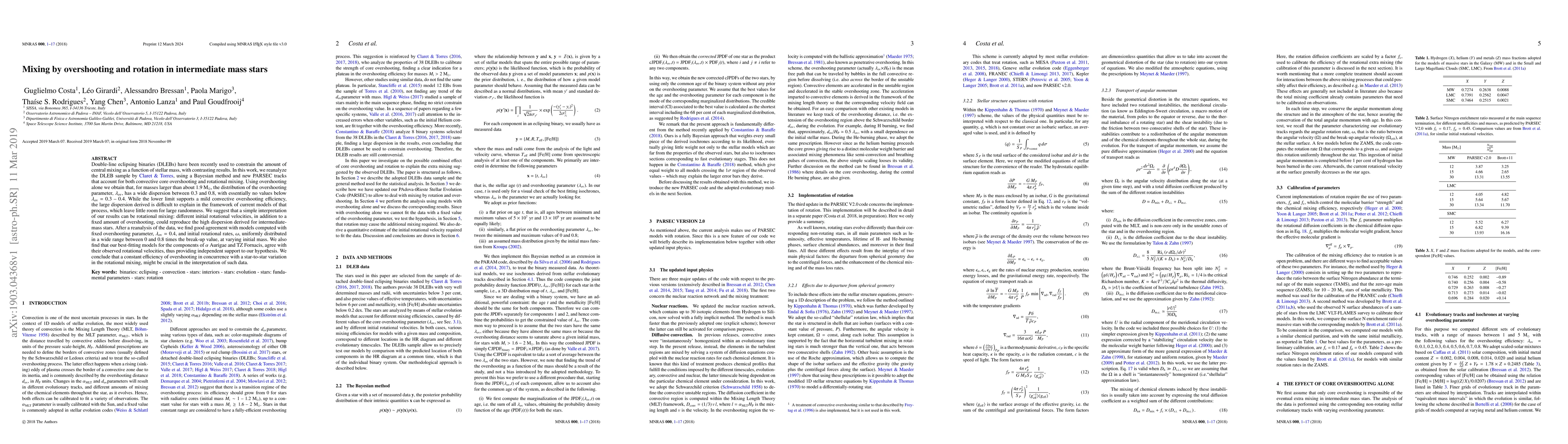 Double-line eclipsing binaries (DLEBs) have been recently used to constrain the amount of central mixing as a function of stellar mass, with contrasting results. In this work, we reanalyze the DLEB sample by Claret & Torres, using a Bayesian method and new PARSEC tracks that account for both convective core overshooting and rotational mixing. Using overshooting alone we obtain that, for masses larger than about 1.9 M$_{\odot}$, the distribution of the overshooting parameter, $\lambda_\mathrm{ov}$, has a wide dispersion between 0.3 and 0.8, with essentially no values below $\lambda_\mathrm{ov}=$ 0.3 - 0.4. While the lower limit supports a mild convective overshooting efficiency, the large dispersion derived is difficult to explain in the framework of current models of that process, which leave little room for large randomness. We suggest that a simple interpretation of our results can be rotational mixing: different initial rotational velocities, in addition to a fixed amount of overshooting, could reproduce the high dispersion derived for intermediate-mass stars. After a reanalysis of the data, we find good agreement with models computed with fixed overshooting parameter, $\lambda_\mathrm{ov}=0.4$, and initial rotational rates, $\omega$, uniformly distributed in a wide range between $0$ and $0.8$ times the break-up value, at varying initial mass. We also find that our best-fitting models for the components of $\alpha$ Aurigae and TZ Fornacis, agree with their observed rotational velocities, thus providing independent support to our hypothesis. We conclude that a constant efficiency of overshooting in concurrence with a star-to-star variation in the rotational mixing, might be crucial in the interpretation of such data.