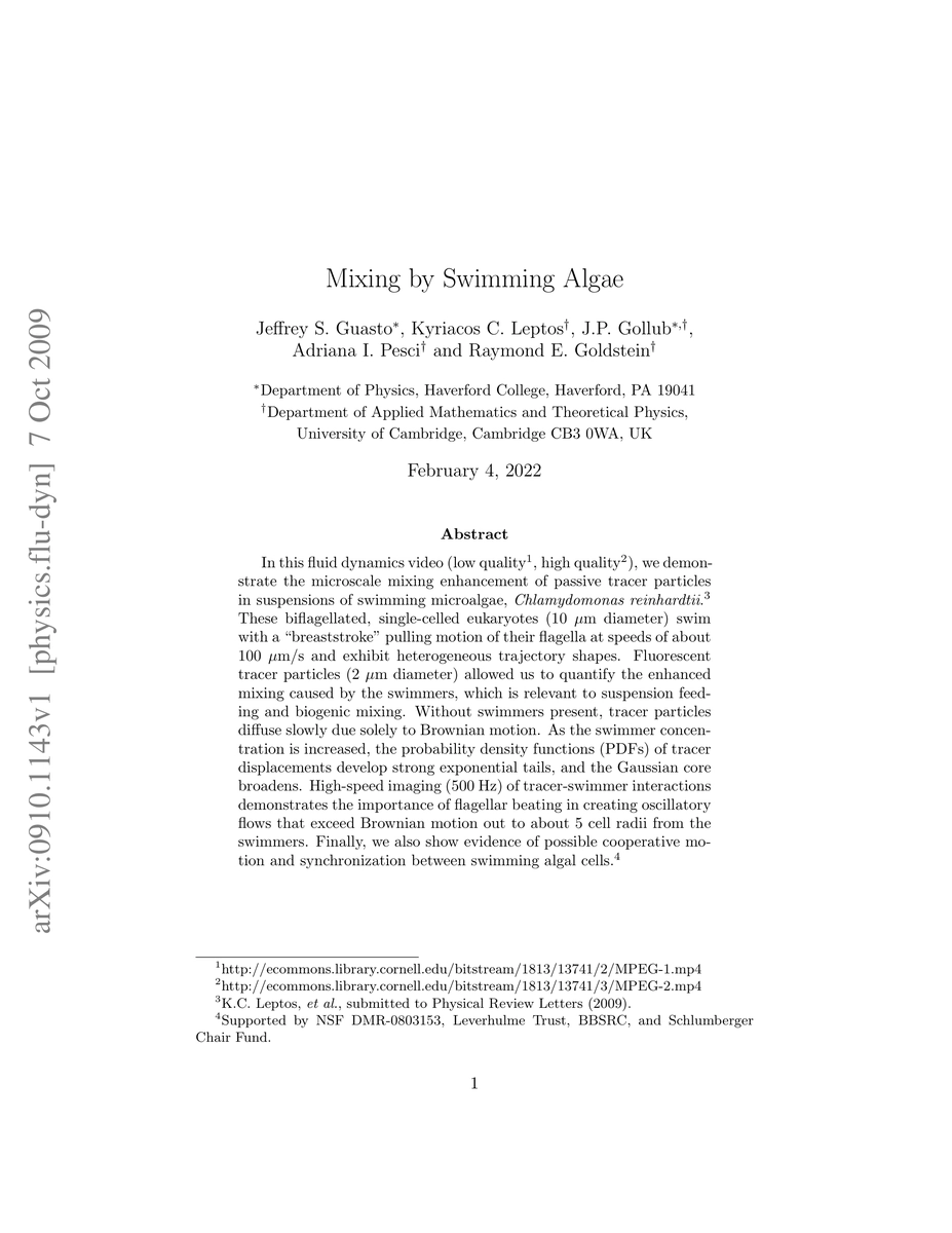 In this fluid dynamics video, we demonstrate the microscale mixing enhancement of passive tracer particles in suspensions of swimming microalgae, Chlamydomonas reinhardtii. These biflagellated, single-celled eukaryotes (10 micron diameter) swim with a "breaststroke" pulling motion of their flagella at speeds of about 100 microns/s and exhibit heterogeneous trajectory shapes. Fluorescent tracer particles (2 micron diameter) allowed us to quantify the enhanced mixing caused by the swimmers, which is relevant to suspension feeding and biogenic mixing. Without swimmers present, tracer particles diffuse slowly due solely to Brownian motion. As the swimmer concentration is increased, the probability density functions (PDFs) of tracer displacements develop strong exponential tails, and the Gaussian core broadens. High-speed imaging (500 Hz) of tracer-swimmer interactions demonstrates the importance of flagellar beating in creating oscillatory flows that exceed Brownian motion out to about 5 cell radii from the swimmers. Finally, we also show evidence of possible cooperative motion and synchronization between swimming algal cells.