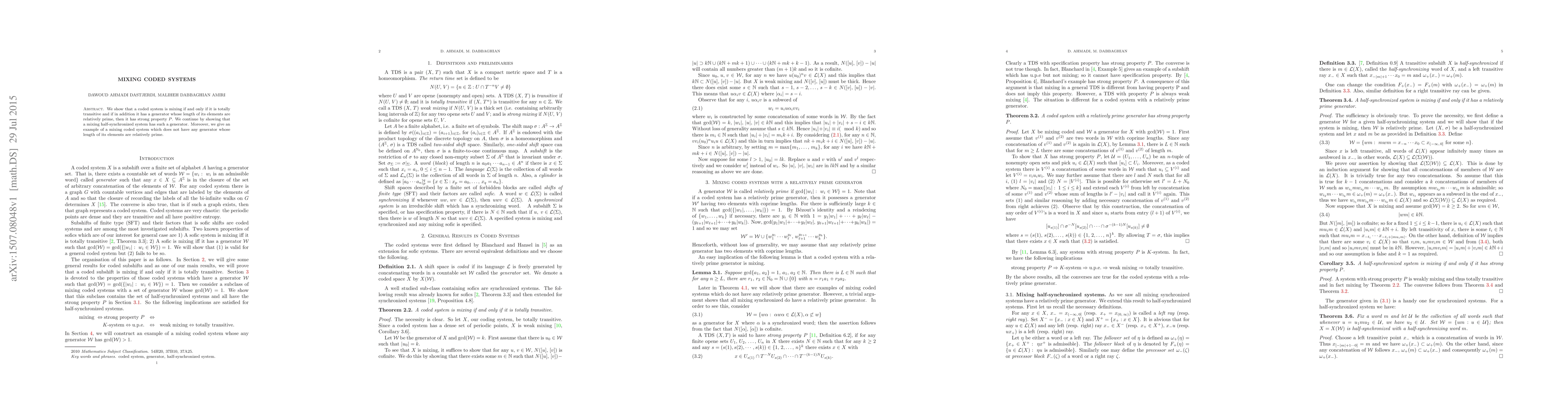 This paper demonstrates that a coded system is mixing if it is totally transitive and possesses a relatively prime generator, which implies strong property P. It also shows that mixing half-synchronized systems have such generators, while providing an example of a mixing coded system lacking any relatively prime generator.