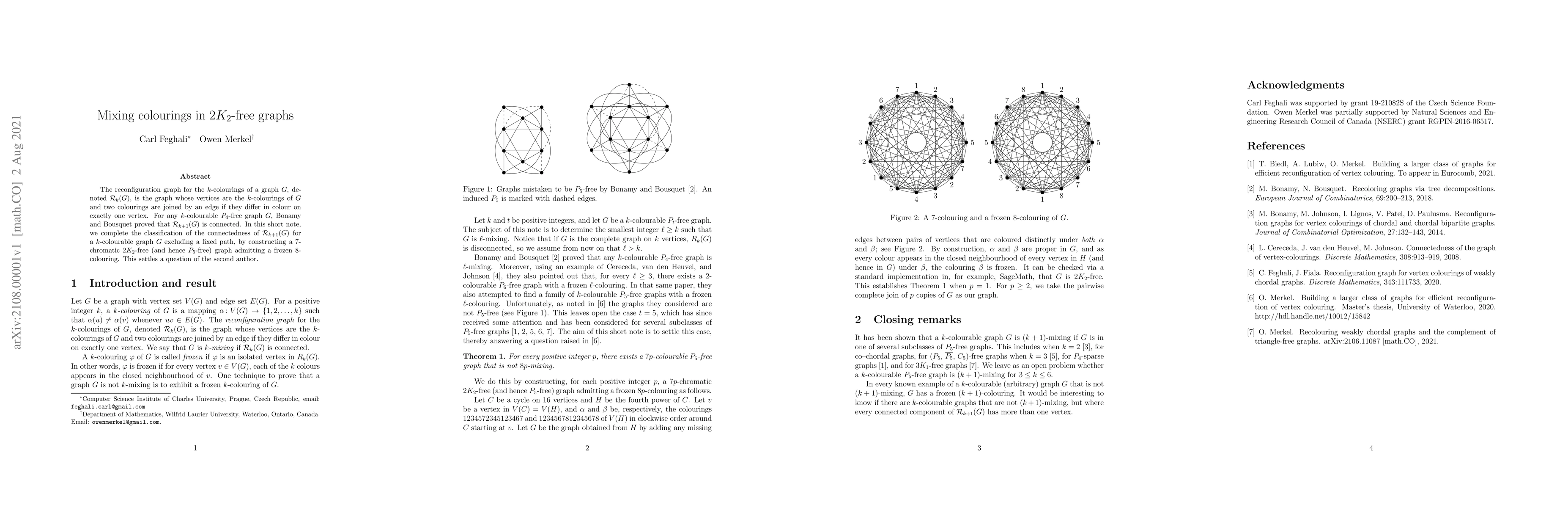 The paper presents a construction method for a 7-chromatic 2K2-free graph with a frozen 8-coloring, which completes the classification of reconfiguration graphs for k-colorable graphs excluding a fixed path.