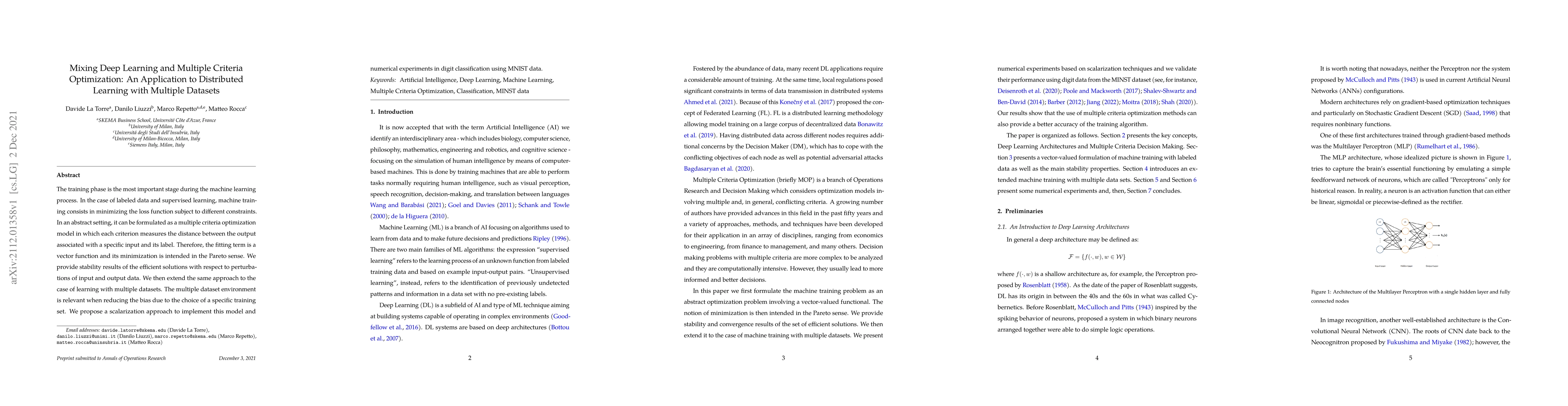 The training phase is the most important stage during the machine learning process. In the case of labeled data and supervised learning, machine training consists in minimizing the loss function subject to different constraints. In an abstract setting, it can be formulated as a multiple criteria optimization model in which each criterion measures the distance between the output associated with a specific input and its label. Therefore, the fitting term is a vector function and its minimization is intended in the Pareto sense. We provide stability results of the efficient solutions with respect to perturbations of input and output data. We then extend the same approach to the case of learning with multiple datasets. The multiple dataset environment is relevant when reducing the bias due to the choice of a specific training set. We propose a scalarization approach to implement this model and numerical experiments in digit classification using MNIST data.