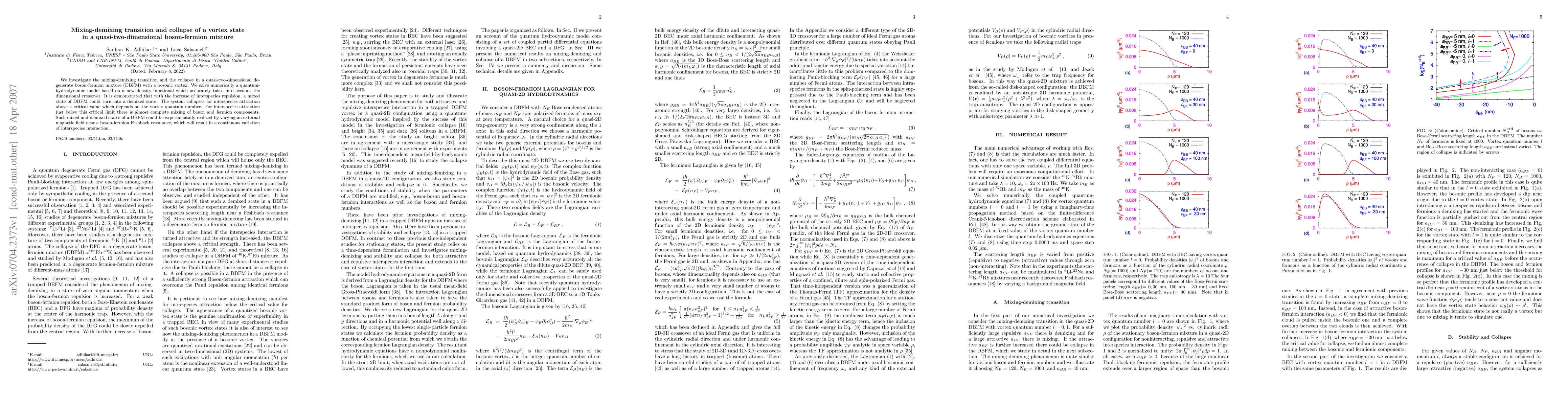 We investigate the mixing-demixing transition and the collapse in a quasi-two-dimensional degenerate boson-fermion mixture (DBFM) with a bosonic vortex. We solve numerically a quantum-hydrodynamic model based on a new density functional which accurately takes into account the dimensional crossover. It is demonstrated that with the increase of interspecies repulsion, a mixed state of DBFM could turn into a demixed state. The system collapses for interspecies attraction above a critical value which depends on the vortex quantum number. For interspecies attraction just below this critical limit there is almost complete mixing of boson and fermion components. Such mixed and demixed states of a DBFM could be experimentally realized by varying an external magnetic field near a boson-fermion Feshbach resonance, which will result in a continuous variation of interspecies interaction.