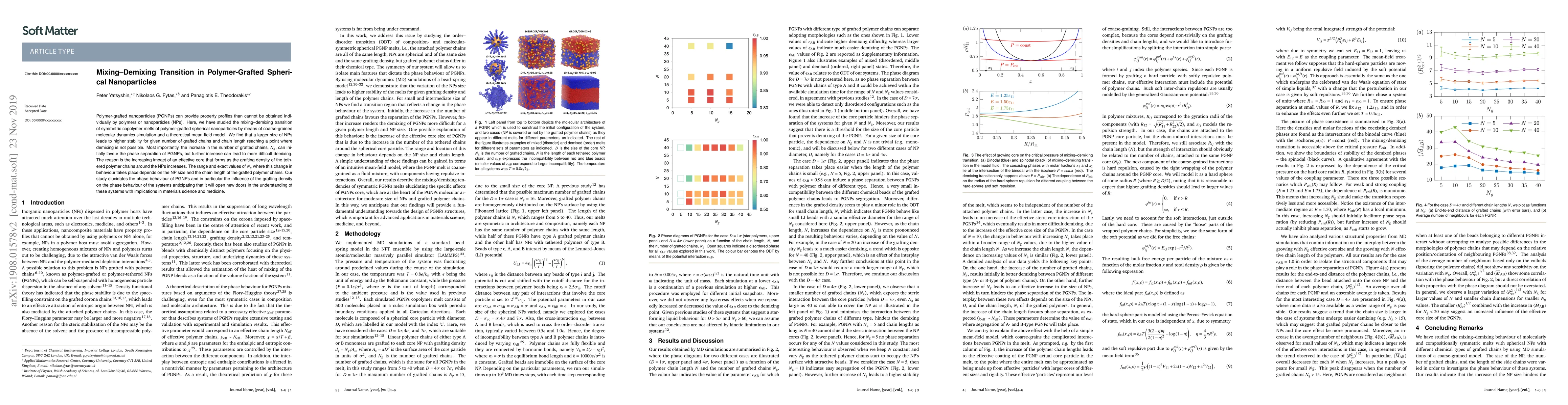 The development and application of a coarse-grained molecular dynamics simulation and a theoretical mean-field model to study the mixing-demixing transition in symmetric copolymer melts of polymer-grafted spherical nanoparticles.