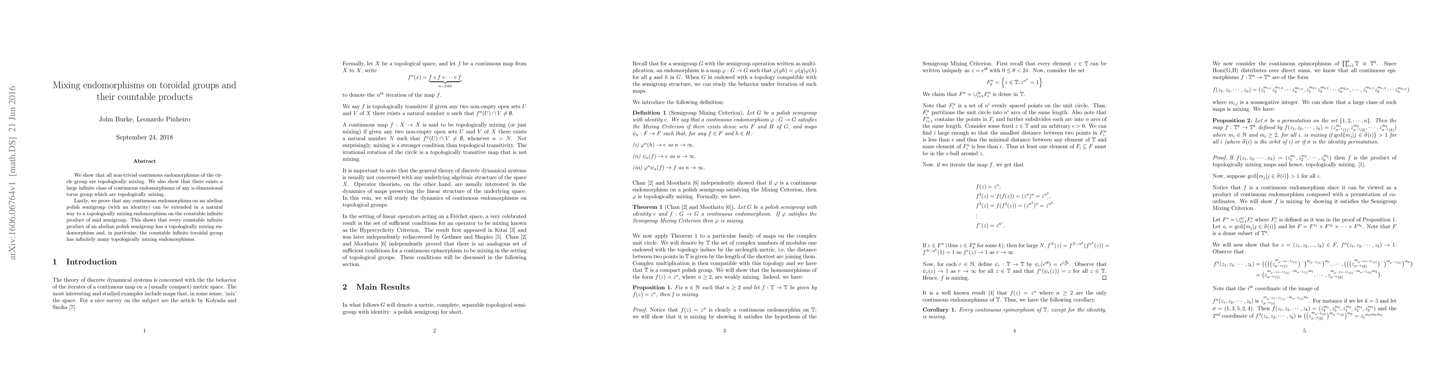 We show that all non-trivial continuous endomorphisms of the circle group are topologically mixing. We also show that there exists a large infinite class of continuous endomorphisms of any n-dimensional torus group which are topologically mixing. Lastly, we prove that any continuous endomorphism on an abelian polish semigroup (with an identity) can be extended in a natural way to a topologically mixing endomorphism on the countable infinite product of said semigroup. This shows that every countable infinite product of an abelian polish semigroup has a topologically mixing endomorphism and, in particular, the countable infinite toroidal group has infinitely many topologically mixing endomorphisms.