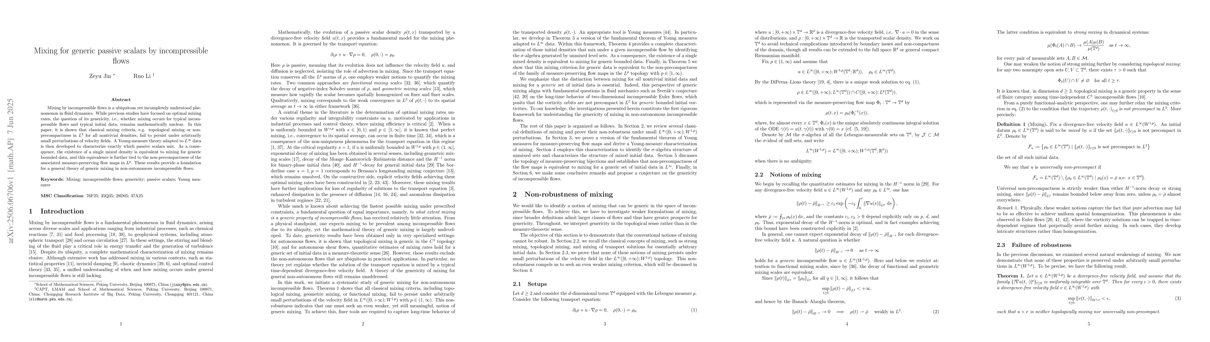 Mixing by incompressible flows is a ubiquitous yet incompletely understood phenomenon in fluid dynamics. While previous studies have focused on optimal mixing rates, the question of its genericity, i.e., whether mixing occurs for typical incompressible flows and typical initial data, remains mathematically unclear. In this paper, it is shown that classical mixing criteria, e.g. topological mixing or non-precompactness in $L^2$ for all nontrivial densities, fail to persist under arbitrarily small perturbations of velocity fields. A Young-measure theory adapted to $L^\infty$ data is then developed to characterize exactly which passive scalars mix. As a consequence, the existence of a single mixed density is equivalent to mixing for generic bounded data, and this equivalence is further tied to the non-precompactness of the associated measure-preserving flow maps in $L^p$. These results provide a foundation for a general theory of generic mixing in non-autonomous incompressible flows.