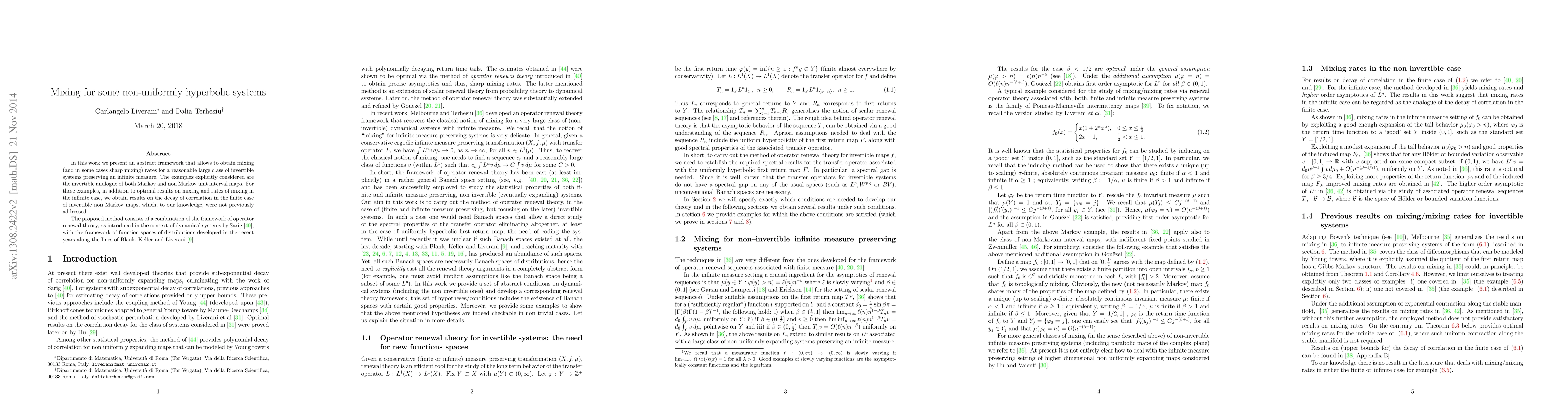 This paper demonstrates mixing properties and sharp mixing rates for a broad class of invertible systems preserving infinite measures, including non-Markov unit interval maps. It combines operator renewal theory with function spaces of distributions to achieve results on correlation decay in finite non-Markov maps, a previously unexplored area.