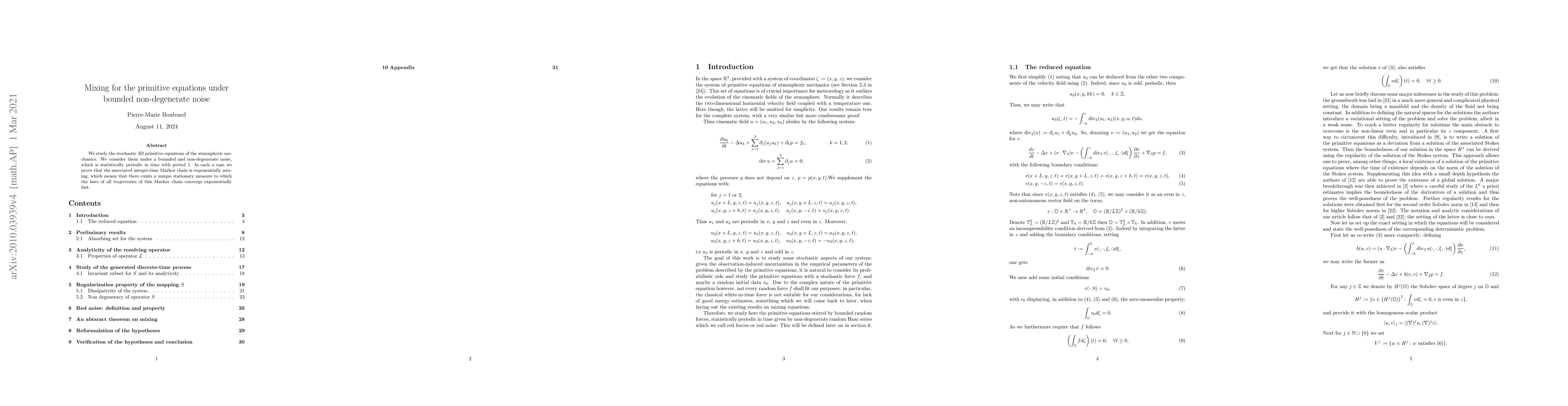 We study the stochastic 3D primitive equations of the atmospheric mechanics. We consider them under a bounded and non-degenerate noise, which is statistically periodic in time with period $1$. In such a case we prove that the associated integer-time Markov chain is mixing, which means that there exists a unique stationary measure to which converge the laws all trajectories of this Markov chain.