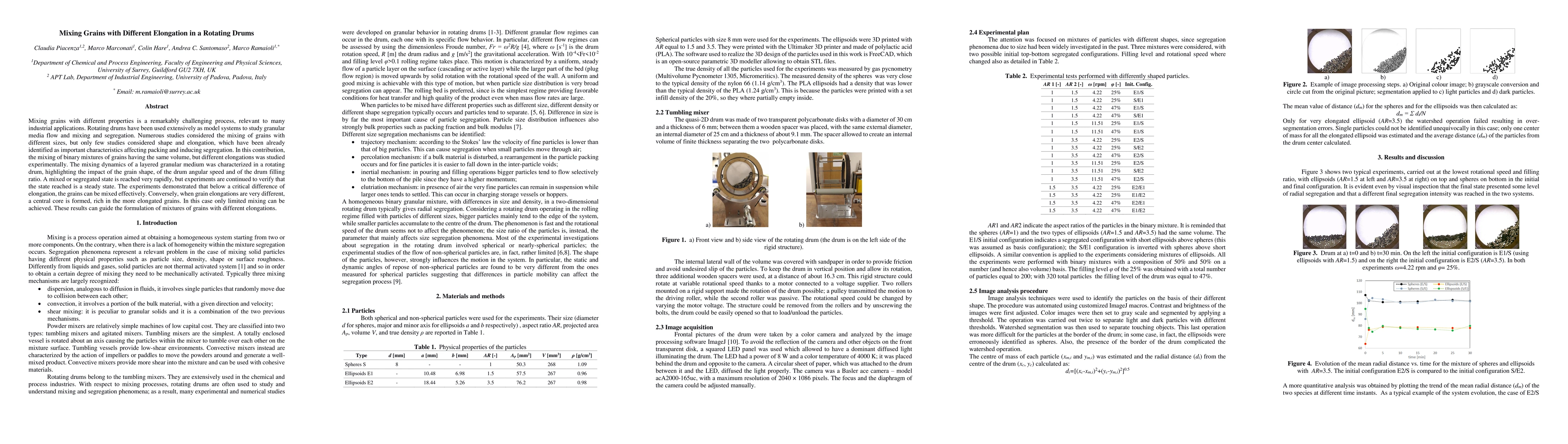 This study experimentally investigates the mixing of binary granular mixtures with identical volumes but different elongations in a rotating drum, revealing that effective mixing occurs when elongation differences are minimal, while significant elongation disparities lead to segregation and limited mixing. The findings provide insights into the dynamics of granular media flow and the factors influencing mixing.