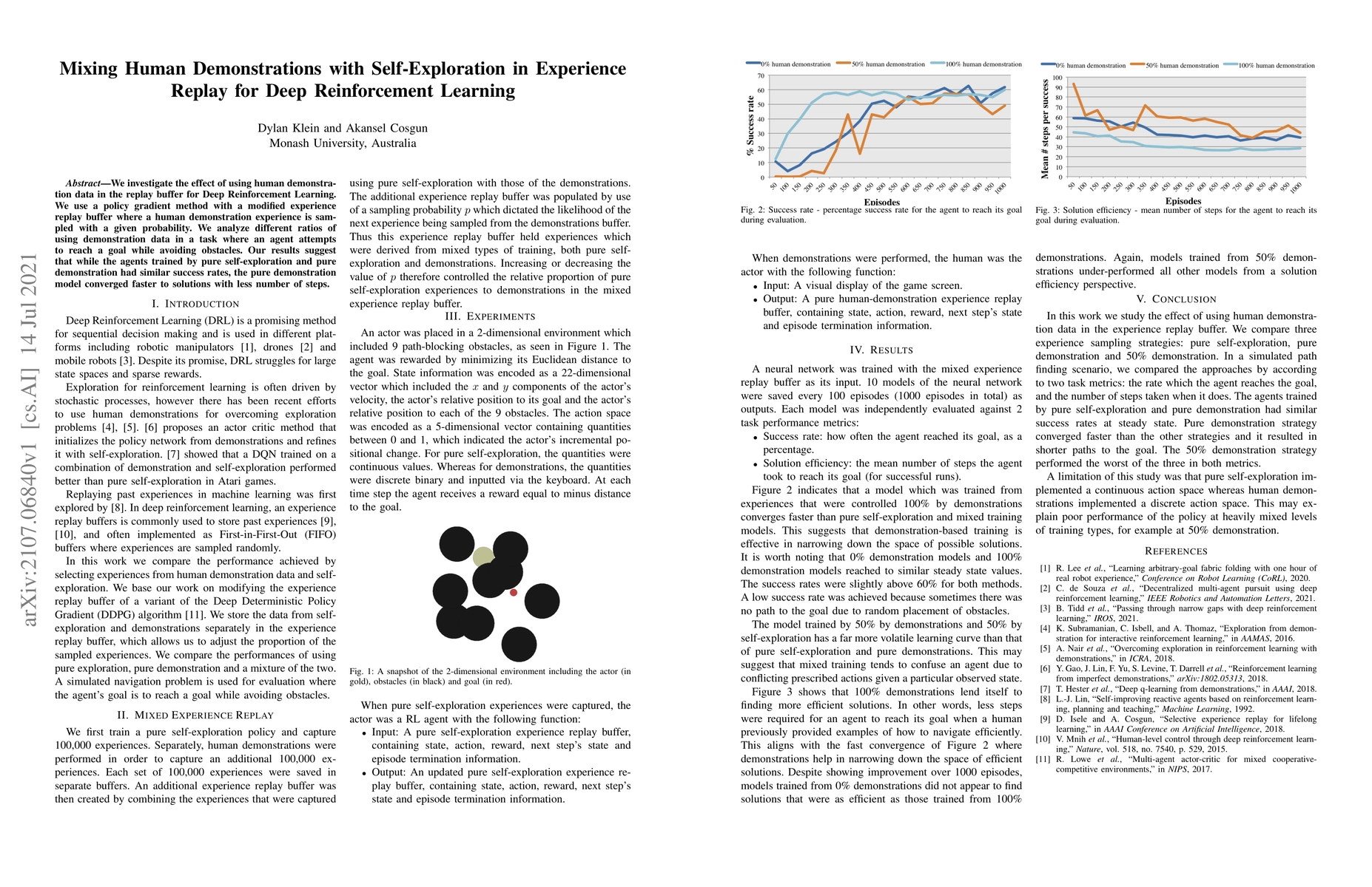 This paper explores combining human demonstration data with self-exploration in a Deep Reinforcement Learning (DRL) experience replay buffer. The study finds that while pure self-exploration and pure demonstration models had similar success rates, the demonstration-based model achieved solutions faster with fewer steps.